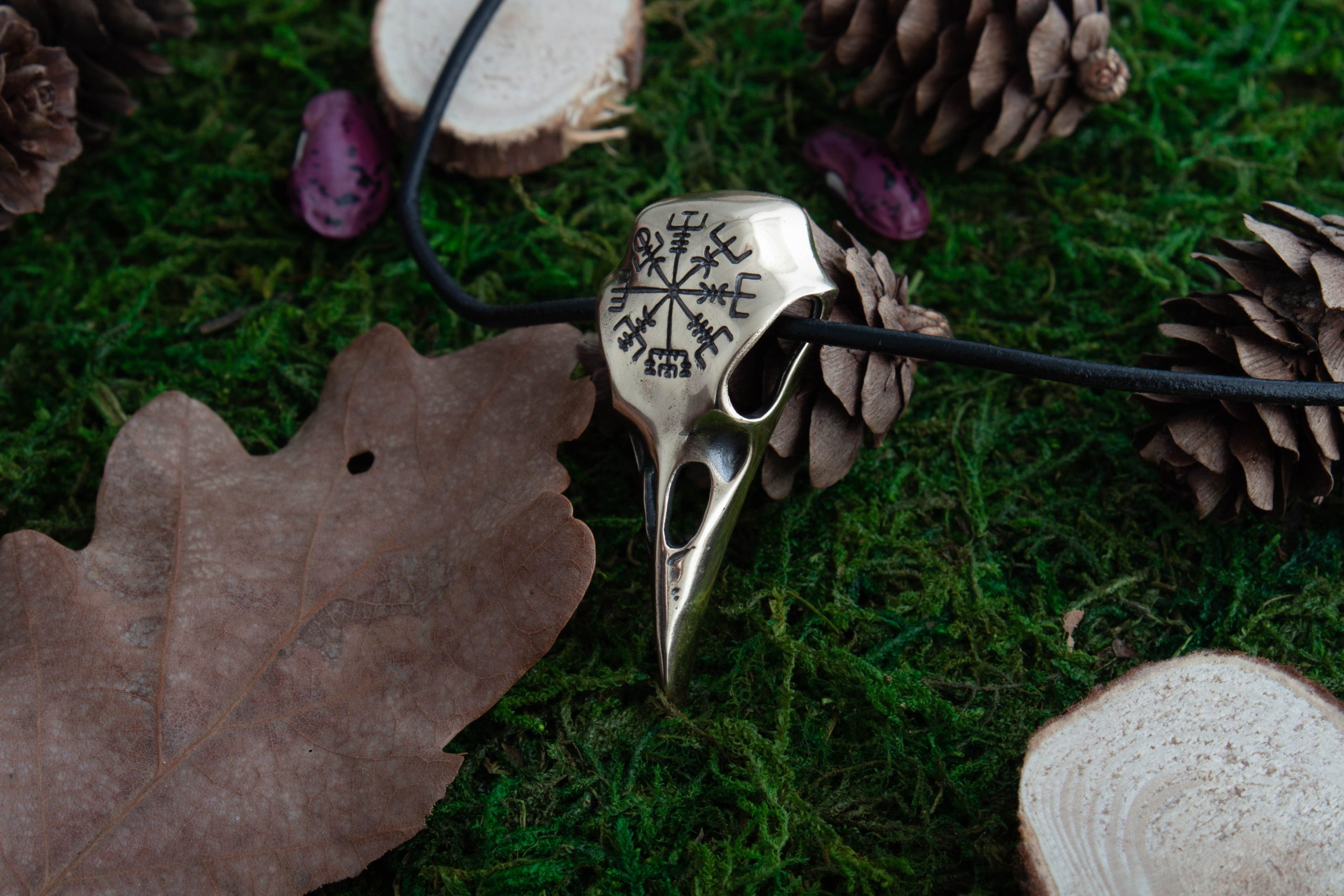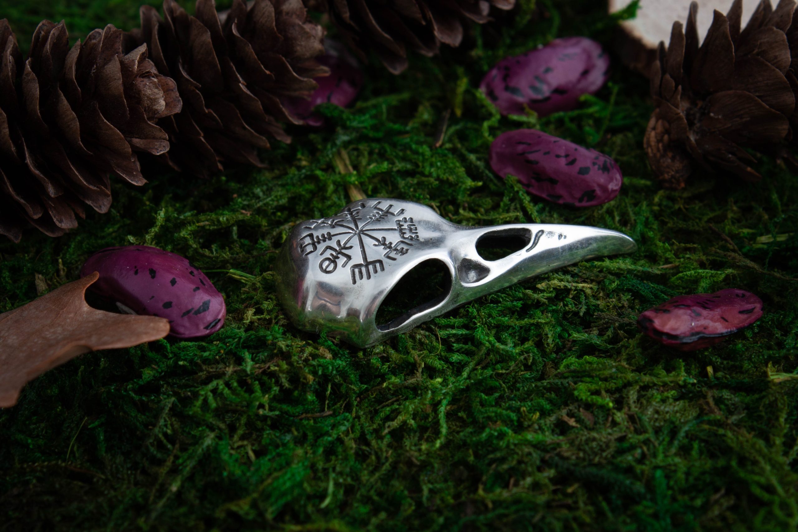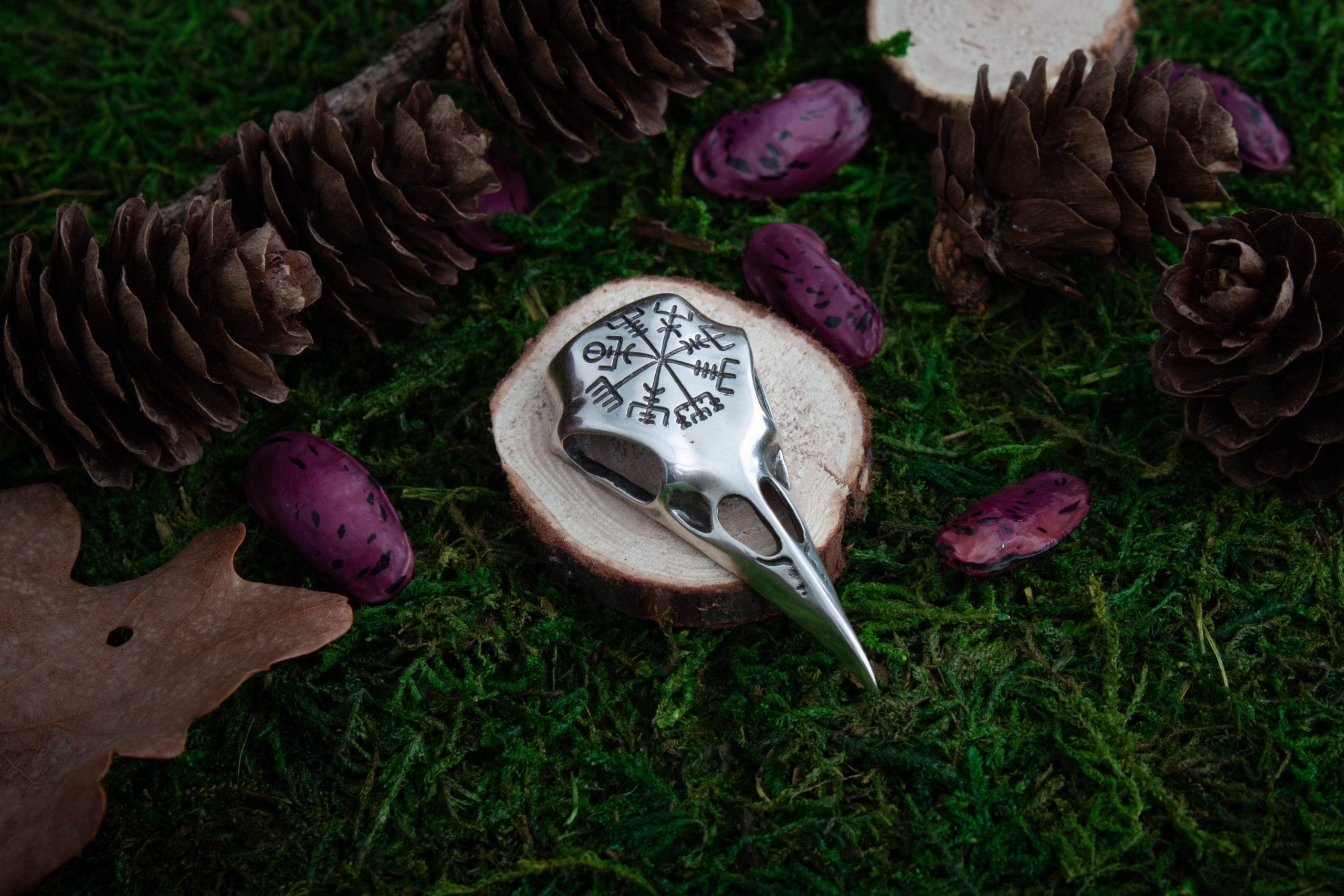 It is believed that a raven skull can seek out restless and cursed souls that have not left the earthly realm and bind them to serve their master. In addition, the skull is considered a powerful protective amulet. The ancient Icelandic symbol Vegvisir engraved on the skull is said to help one stay on the right path and make wise decisions, even in the most difficult circumstances.
