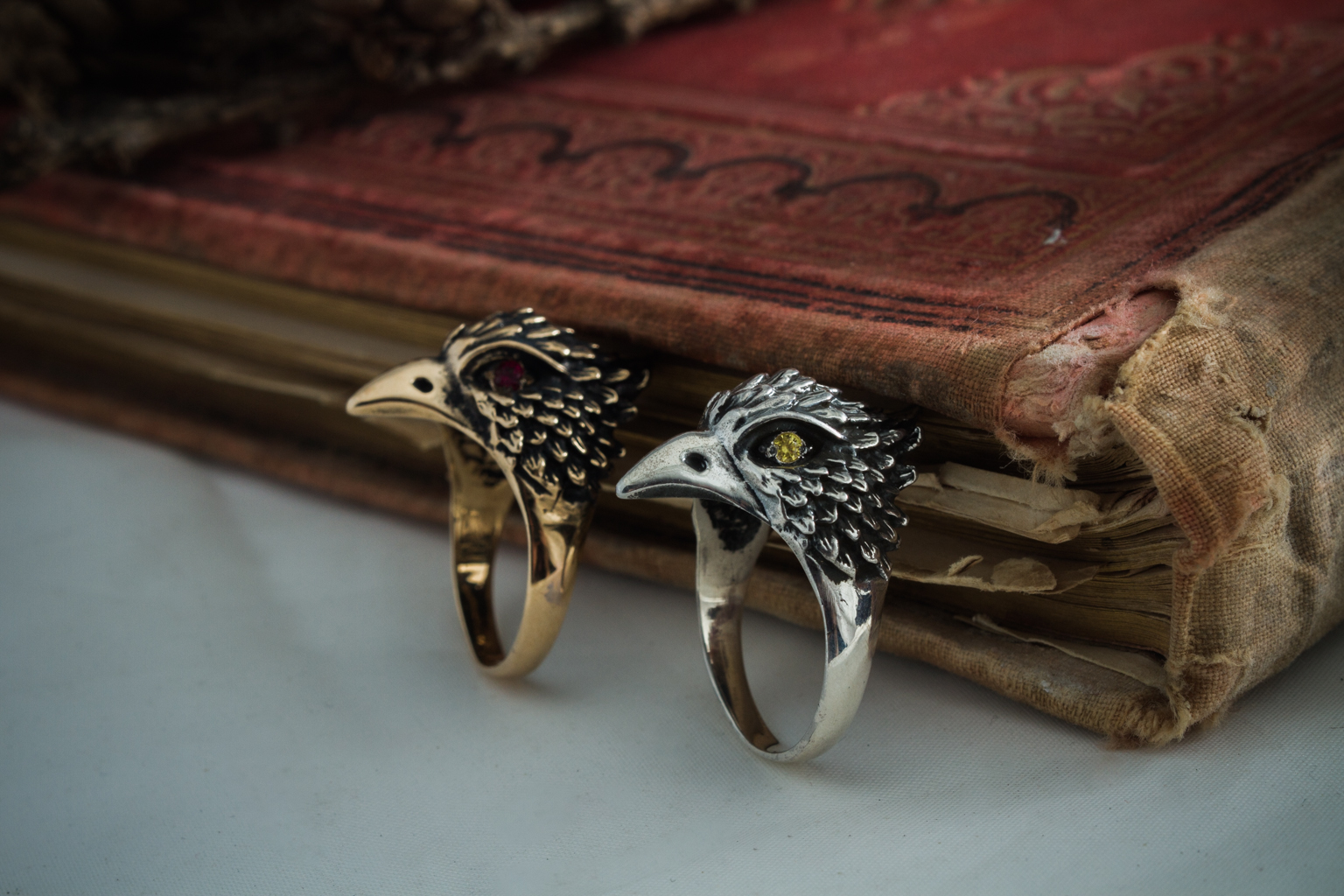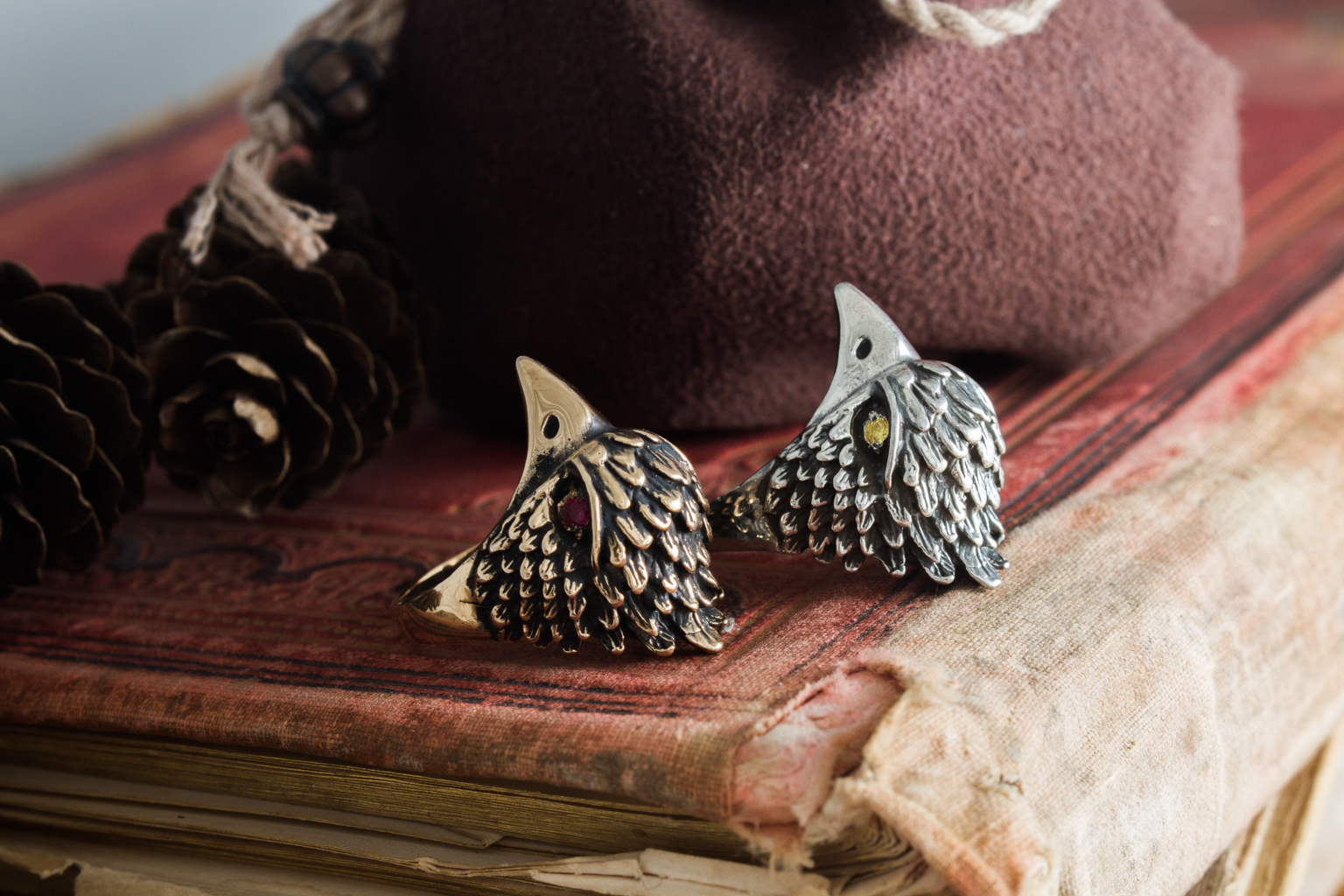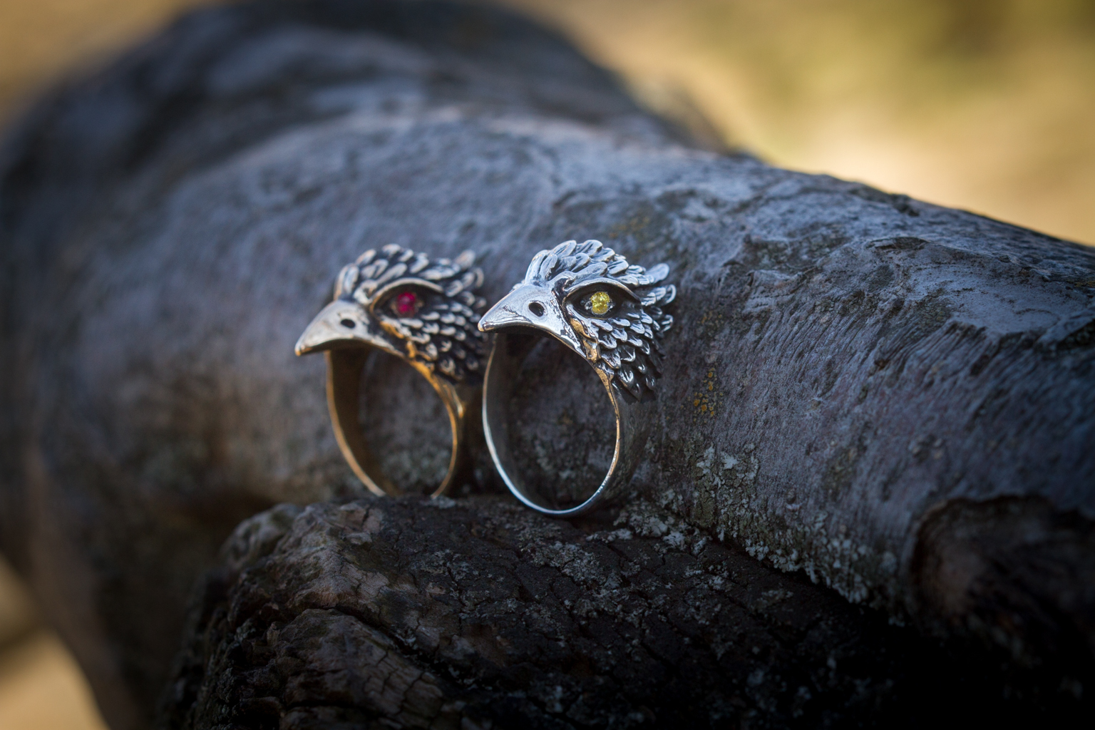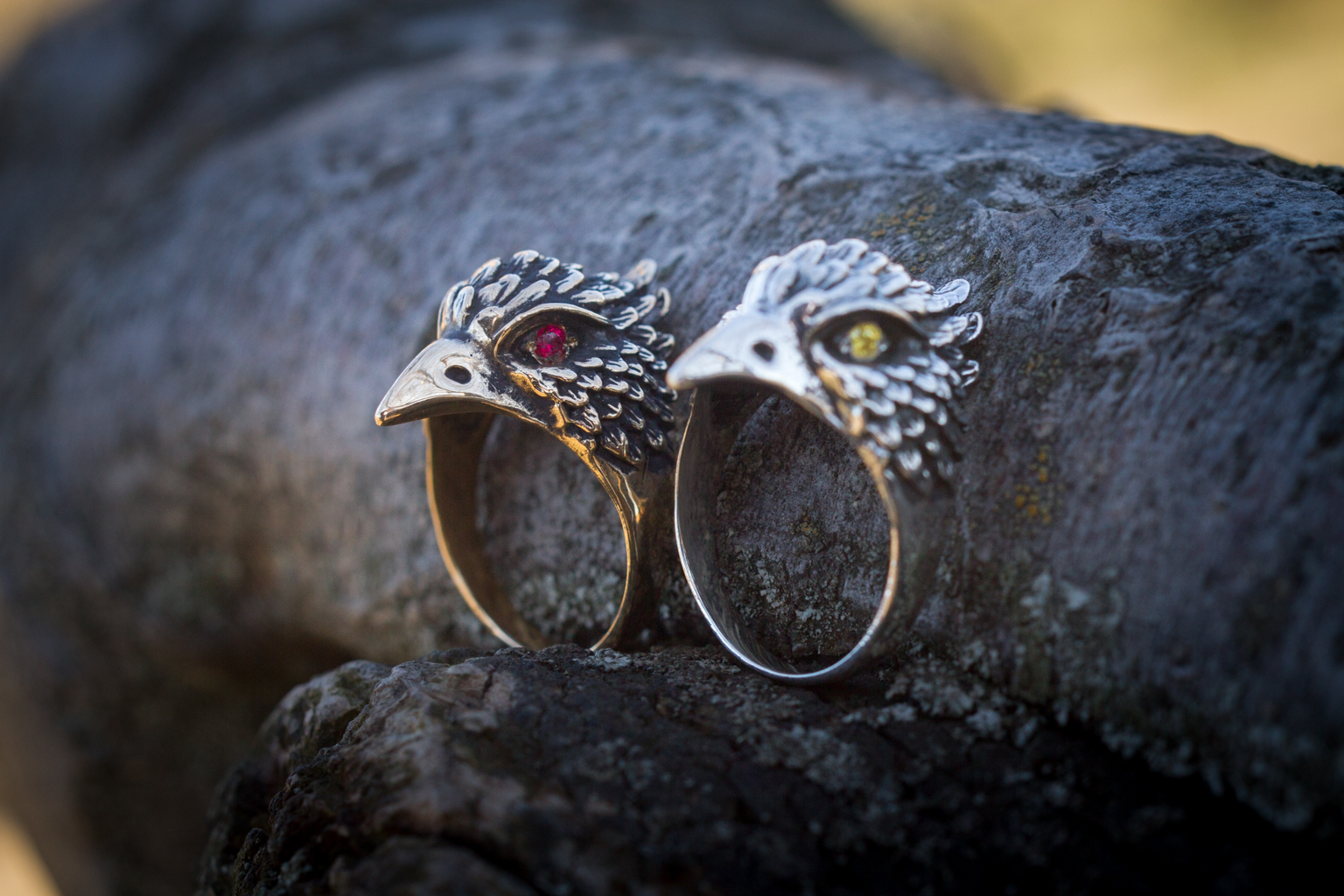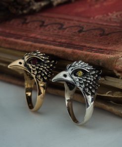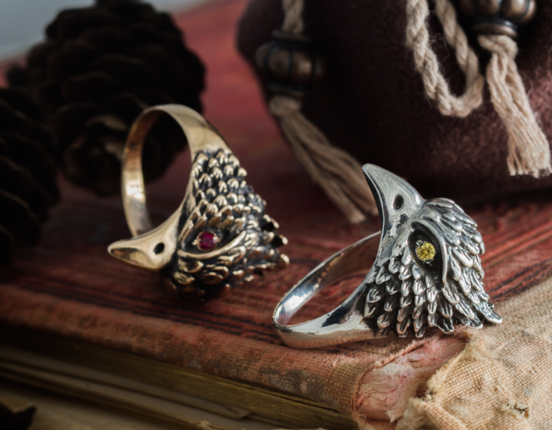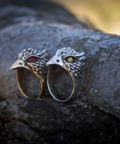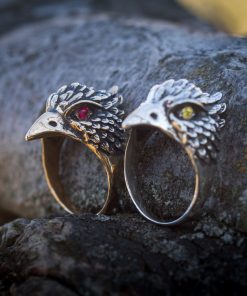 The Bird Ring can be made from bronze or sterling silver. Finished with decorative blackening to emphasize the texture. It may also be adorned with yellow, red, or purple cubic zirconia stones of your choice.