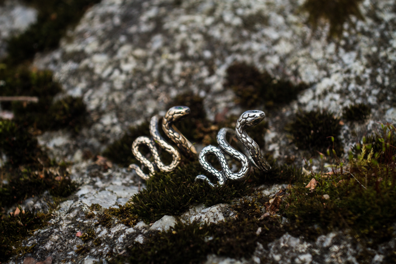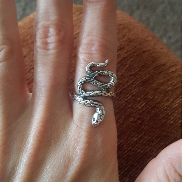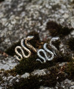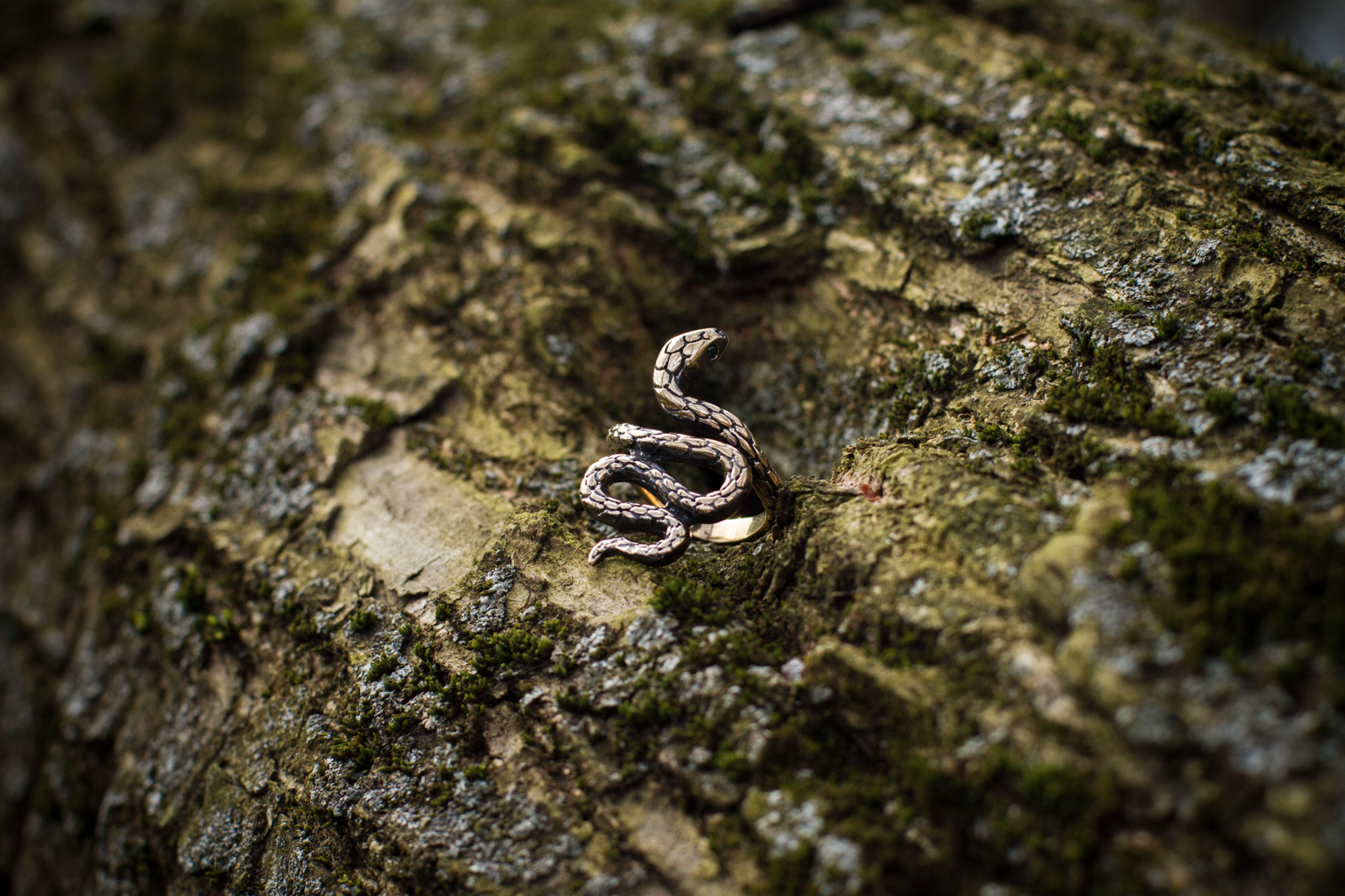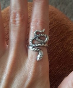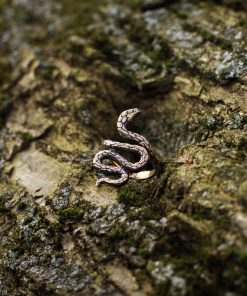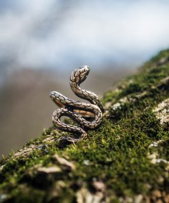 The Snake ring can be made from Bronze or Sterling silver. It is coated with decorative blackening to emphasize the texture and adorned with green cubic zirconia stones.