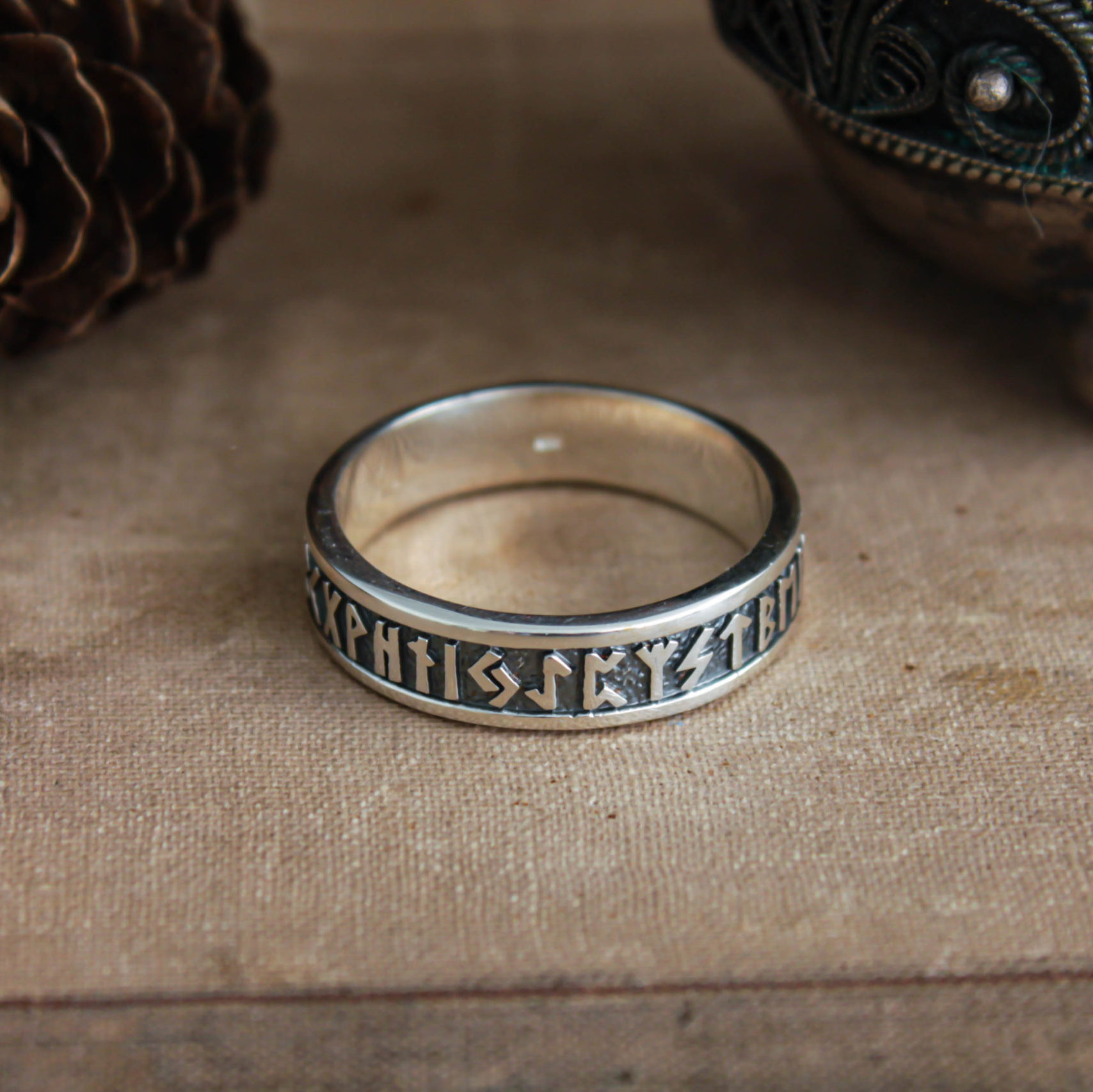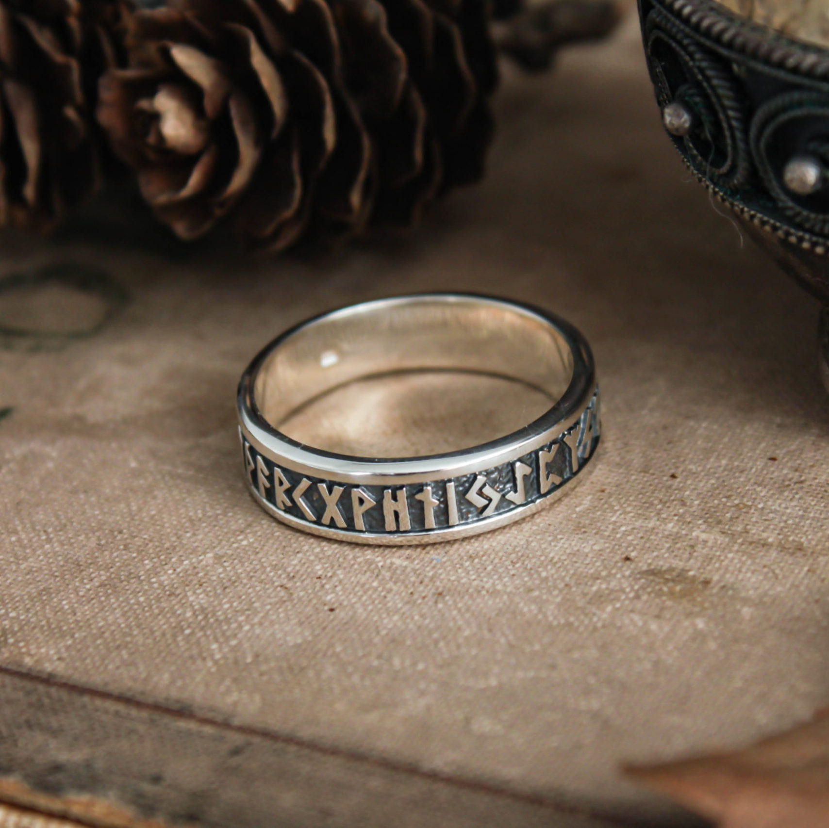 The ring can be made from bronze, sterling silver, or sterling silver with black rhodium plating. Finished with decorative blackening to emphasize the texture.