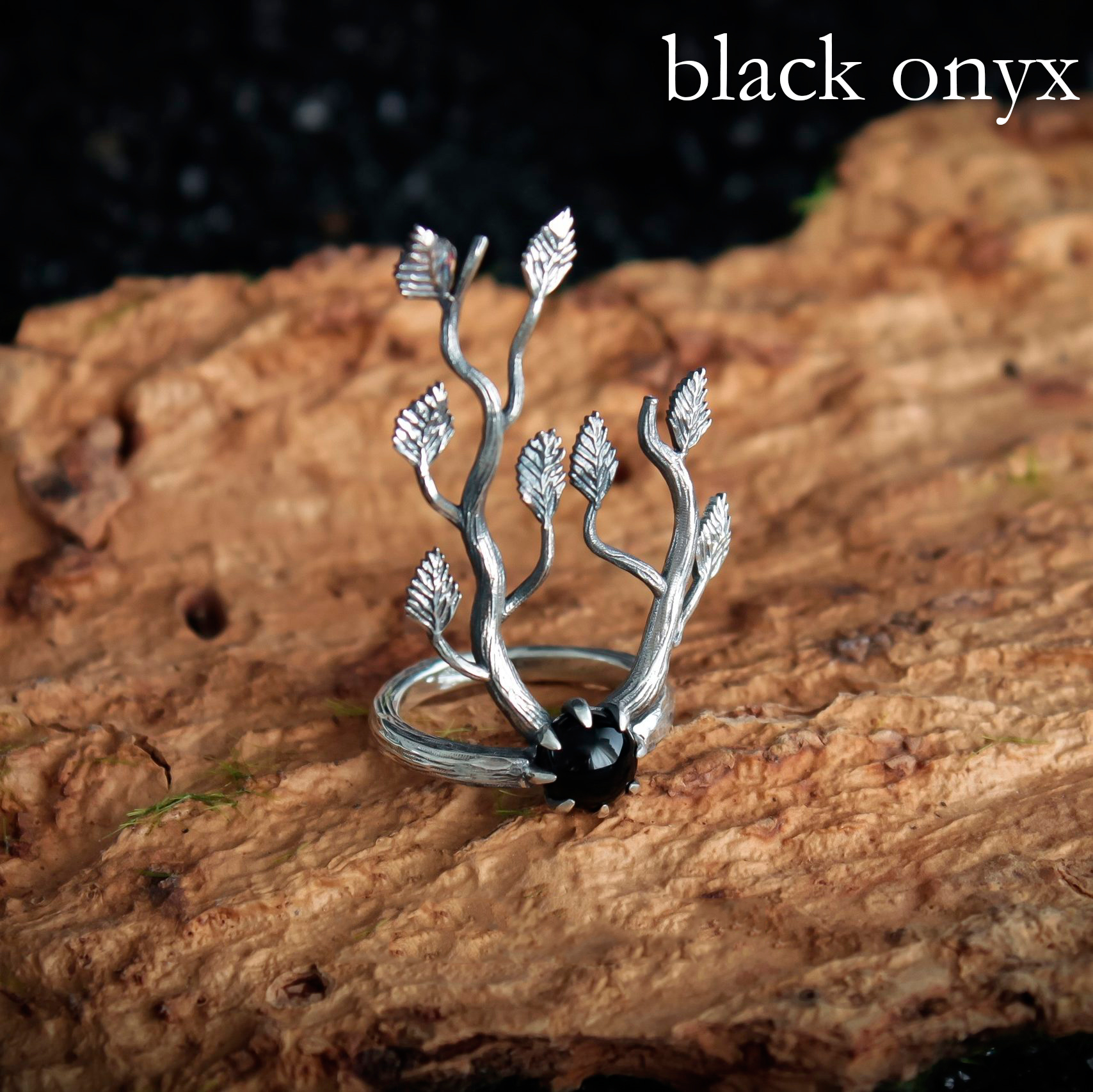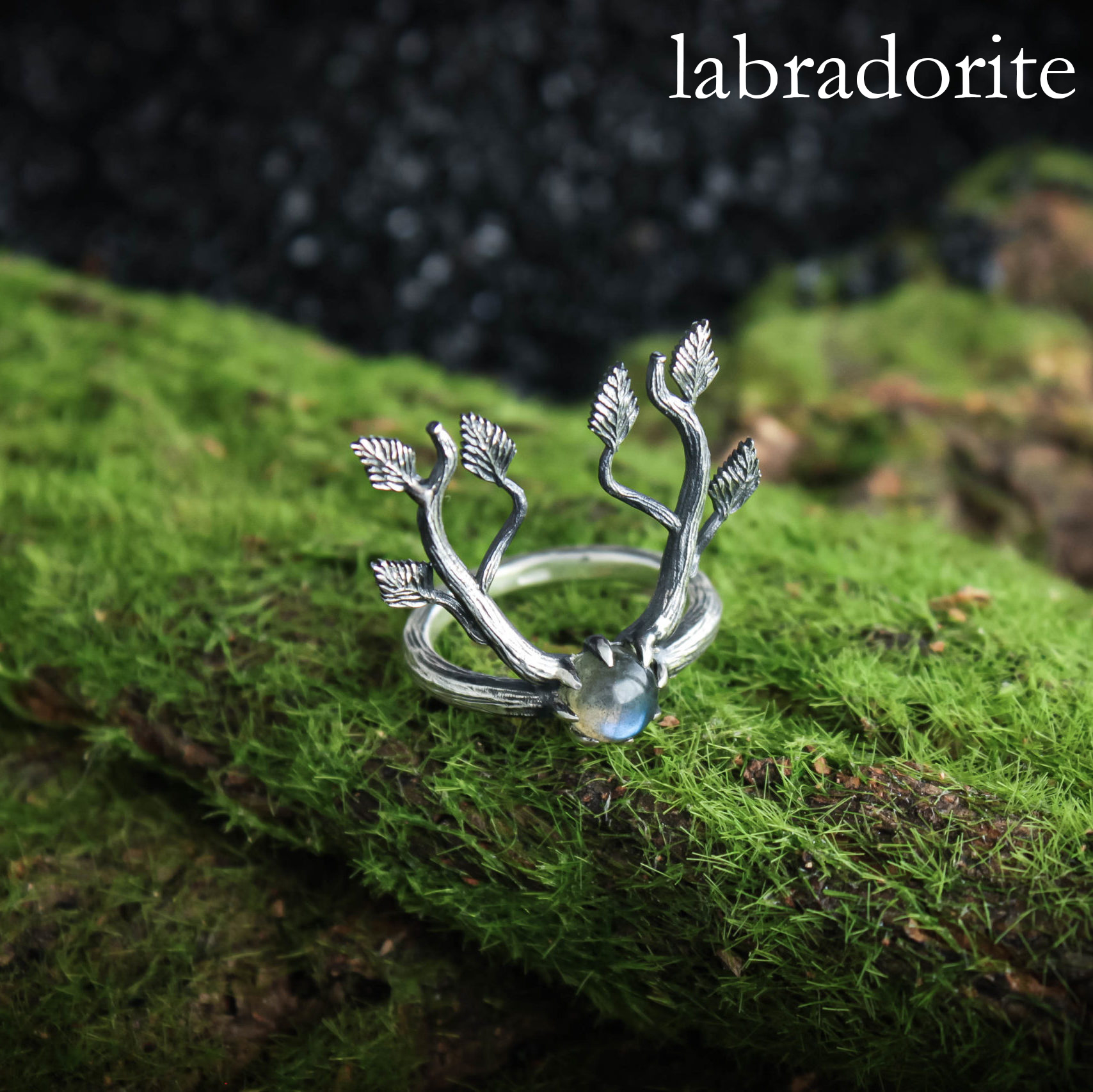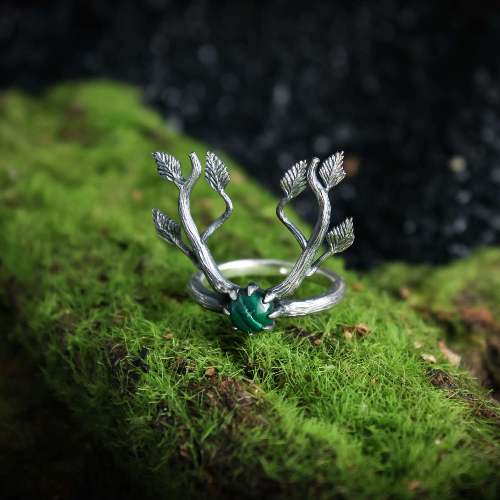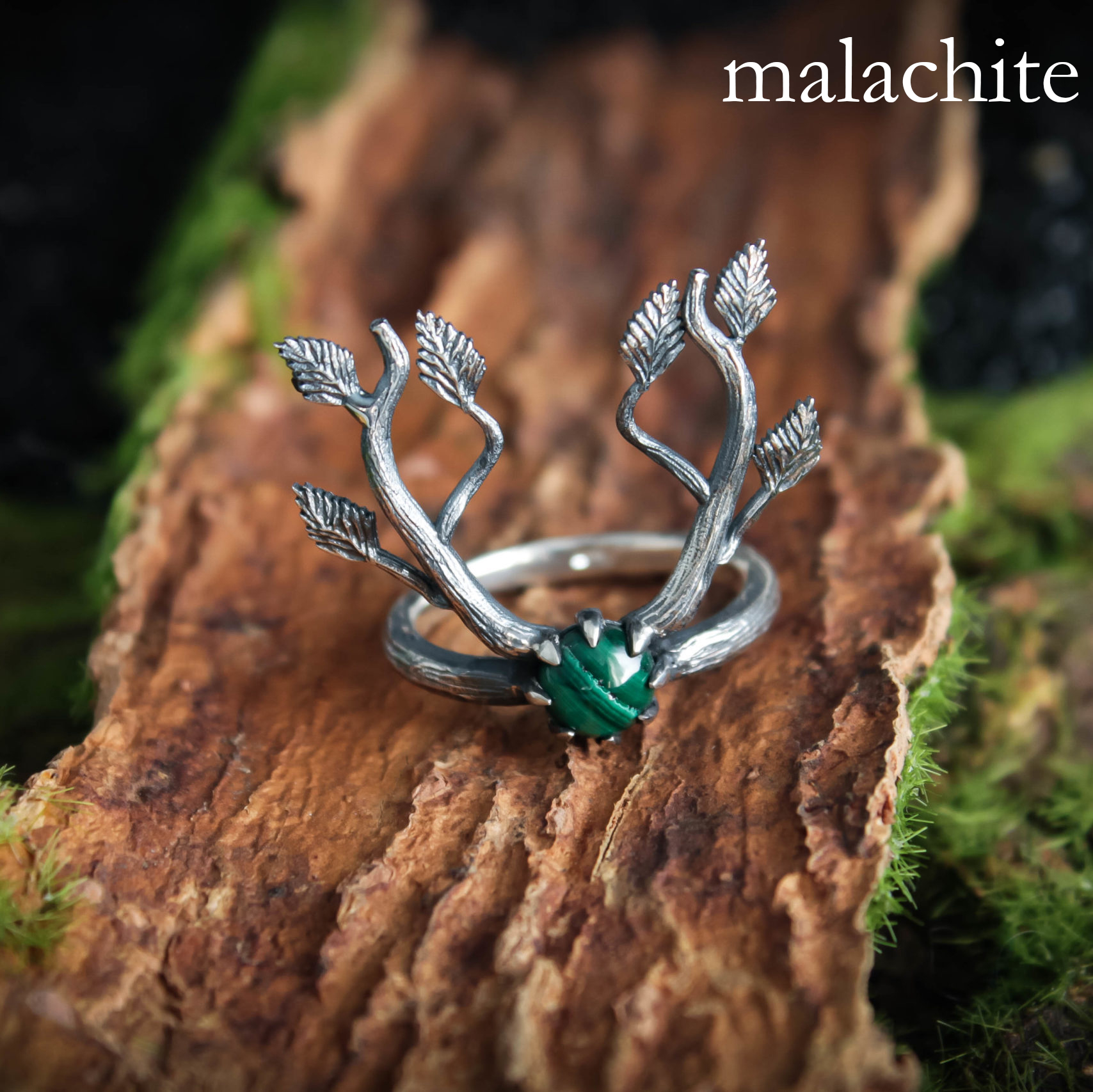 The ring is made of sterling silver with a natural gemstone, features decorative blackening to highlight its textures.