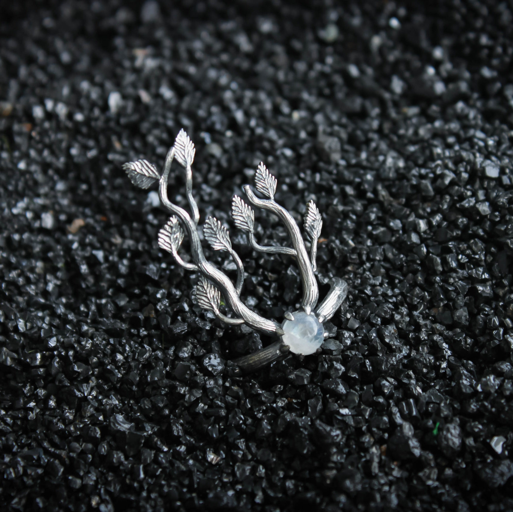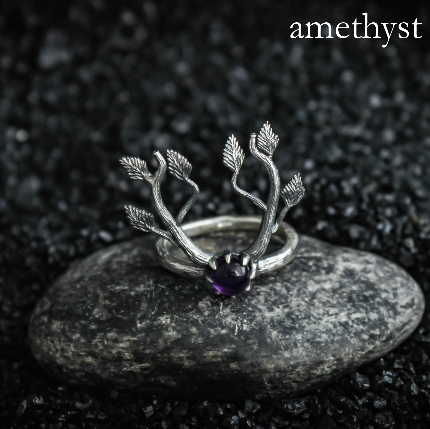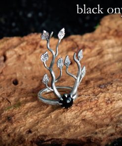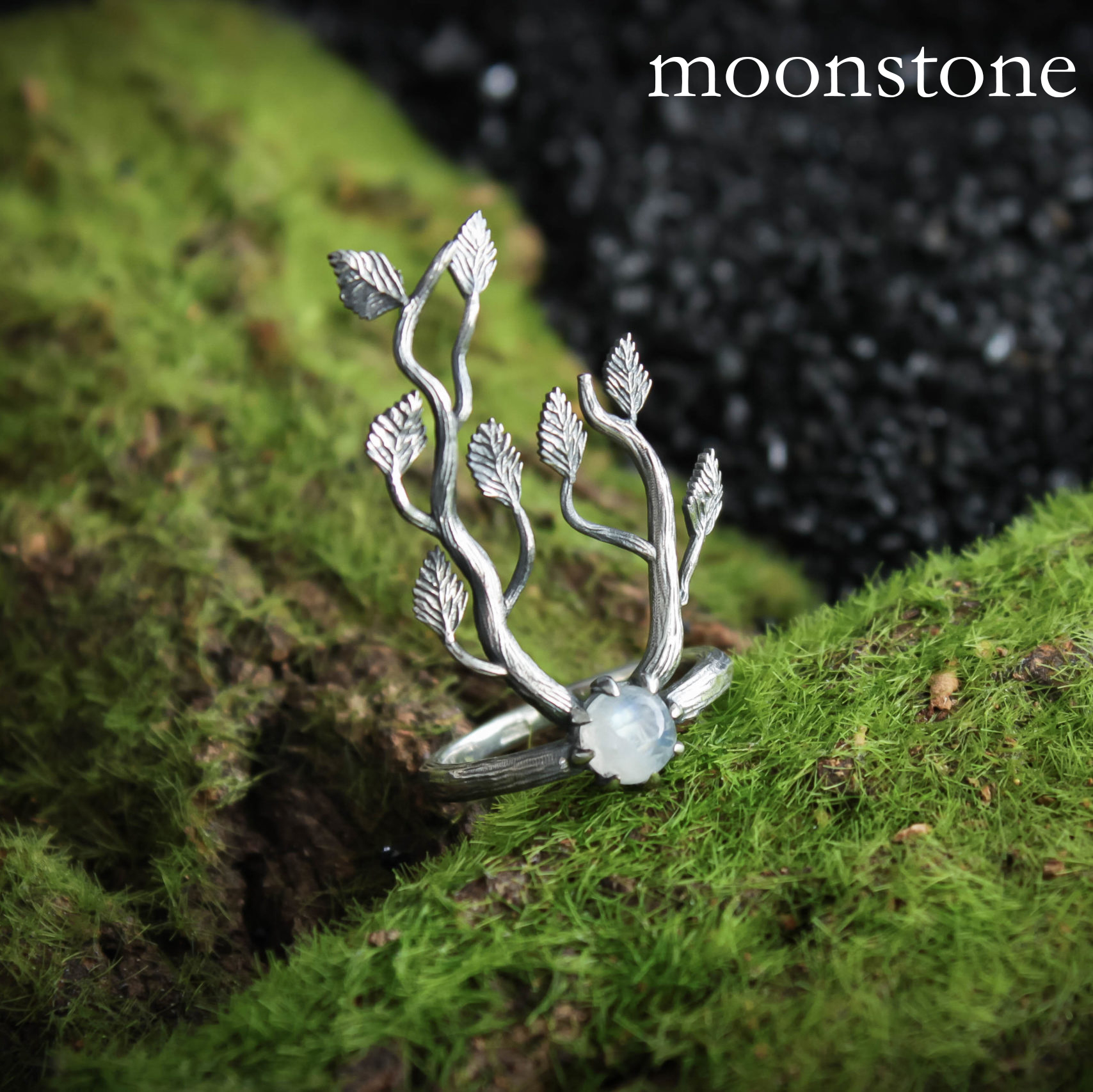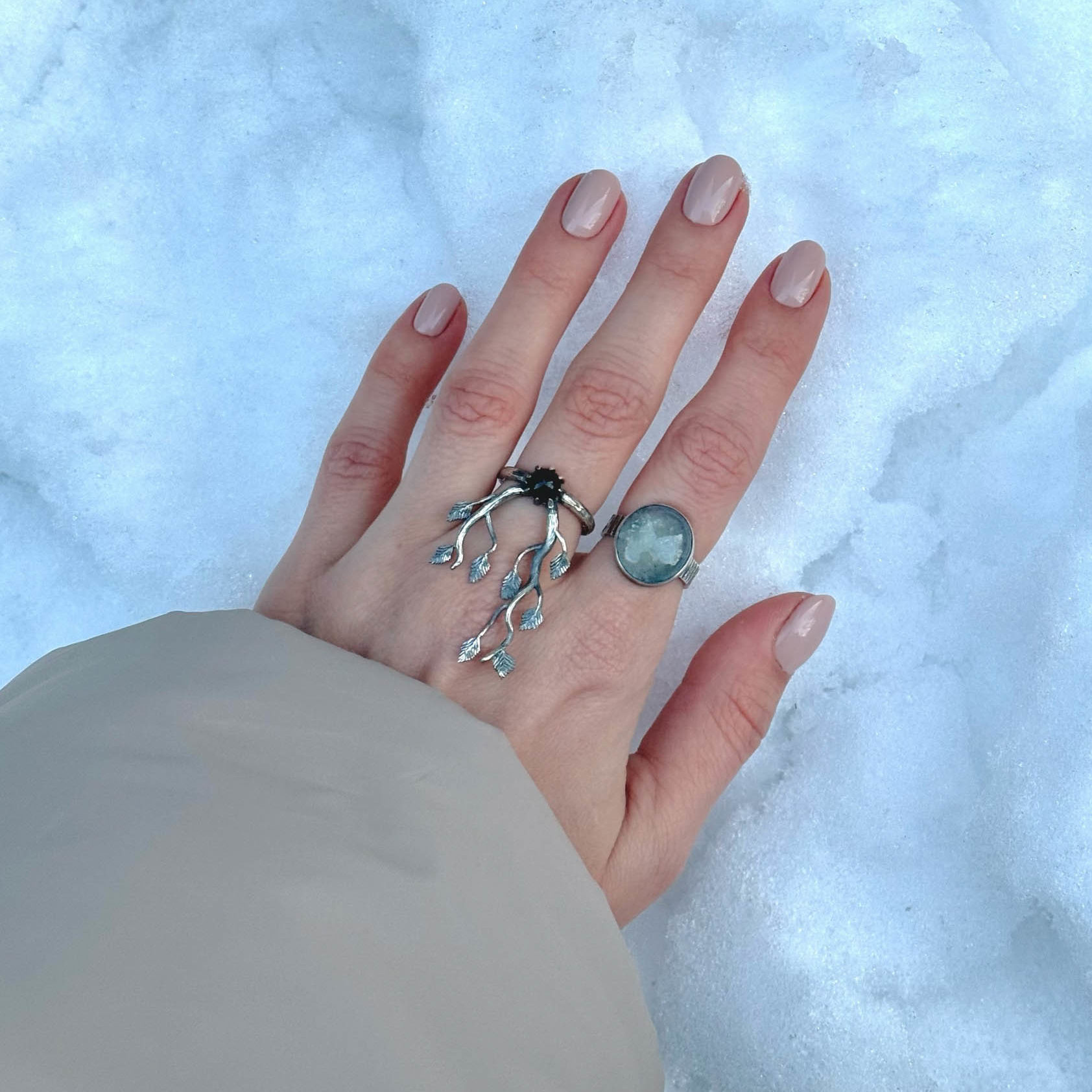 The ring is made of sterling silver with a natural gemstone, features decorative blackening to highlight its textures.