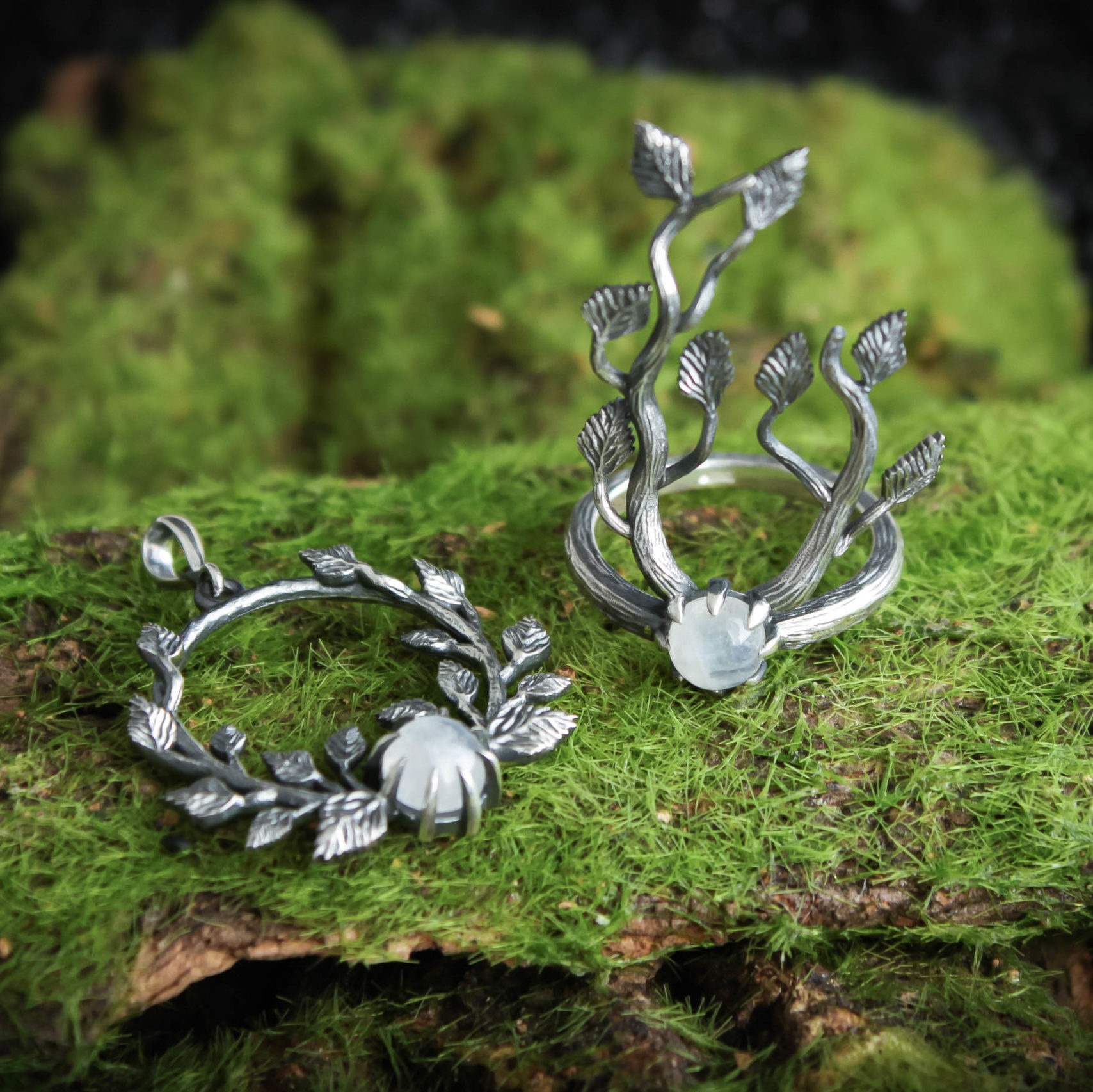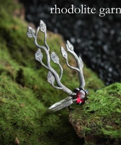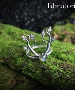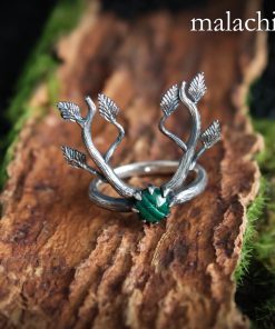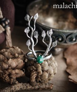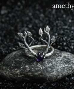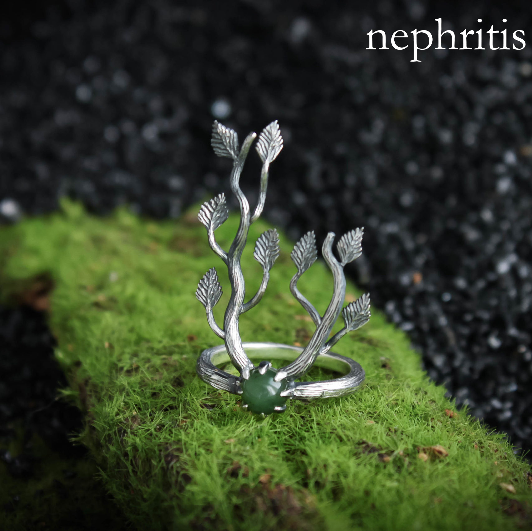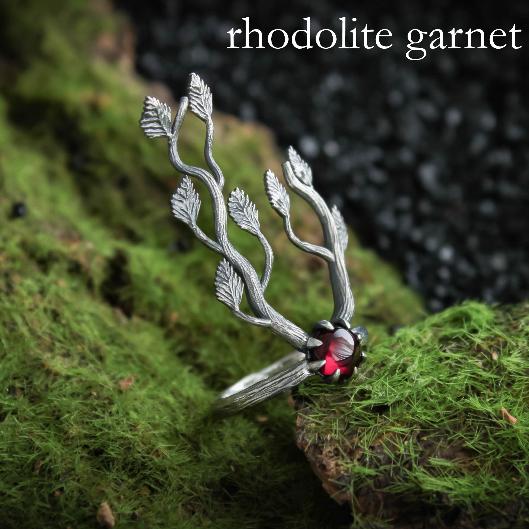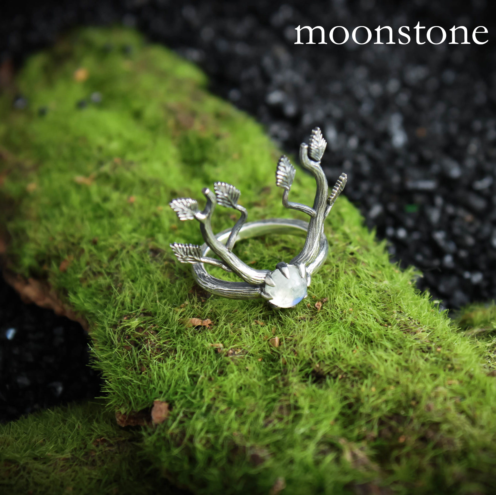 The ring is made of sterling silver with a natural gemstone, features decorative blackening to highlight its textures.
