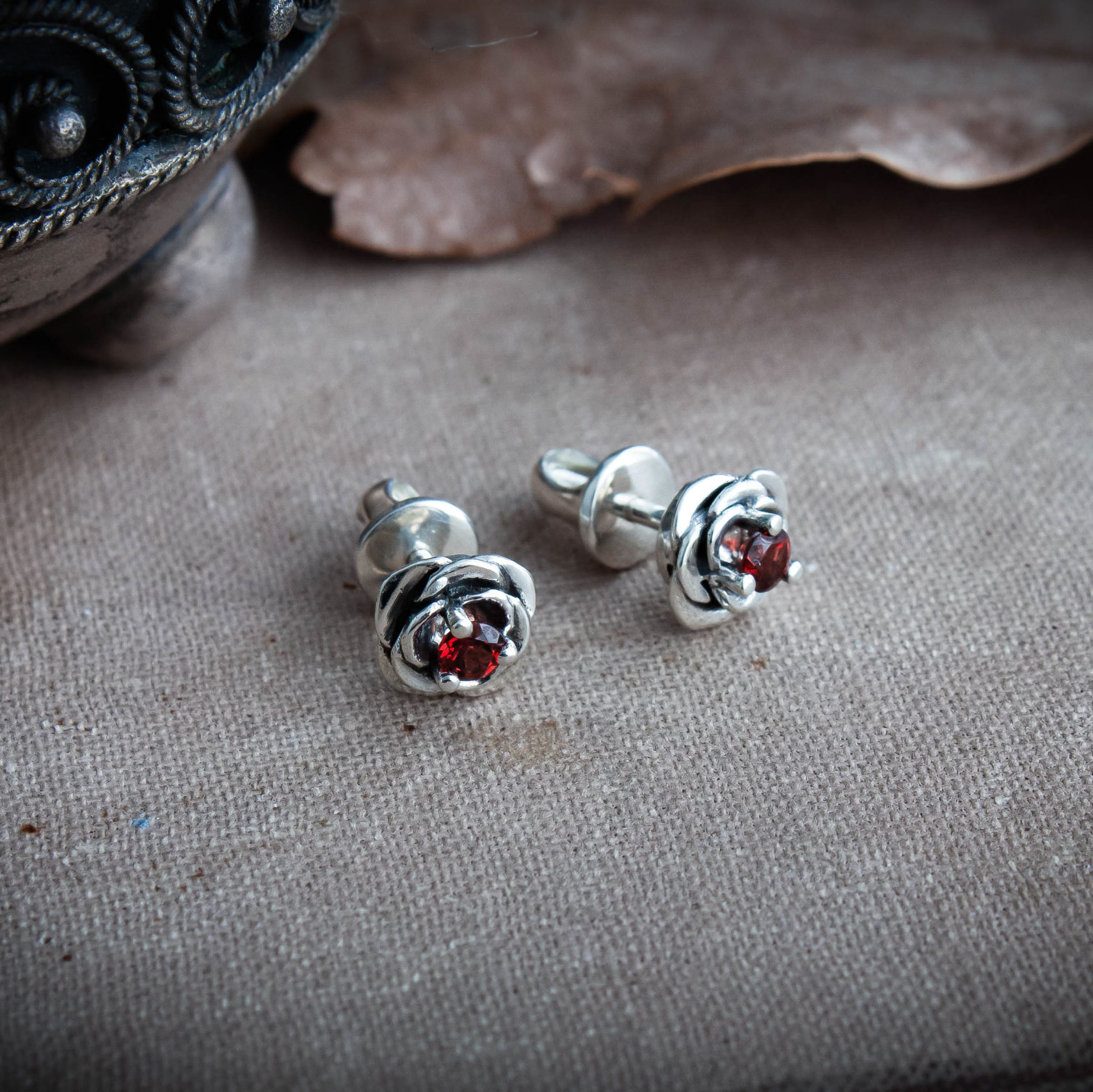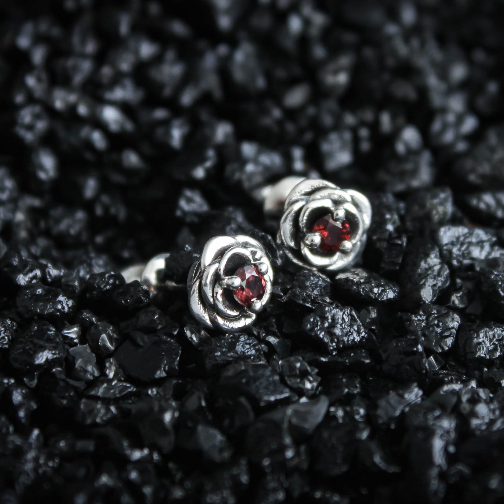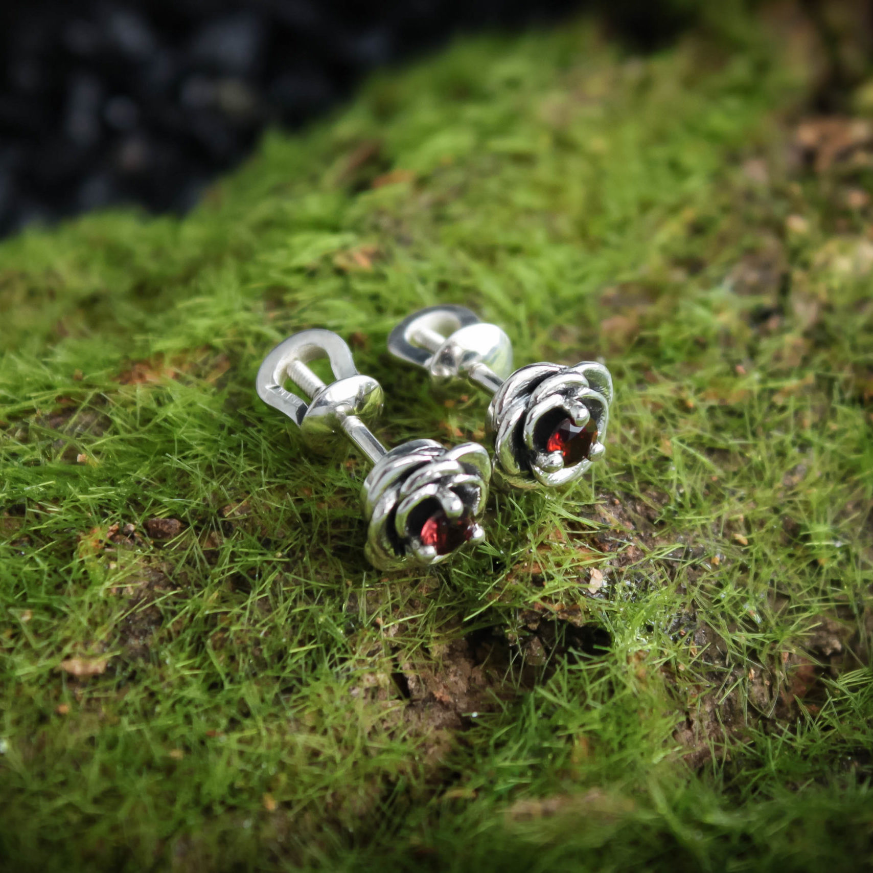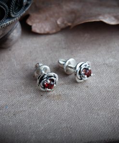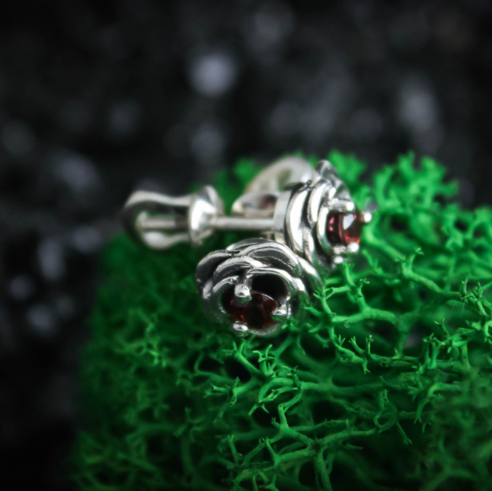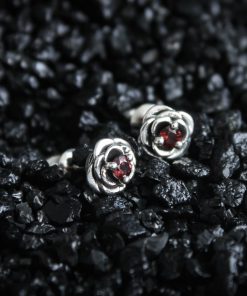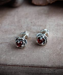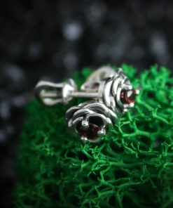 Crafted from silver and coated with decorative blackening to highlight the texture. They can be adorned with cubic zirconia in various colors of your choice or with natural dark red garnets.