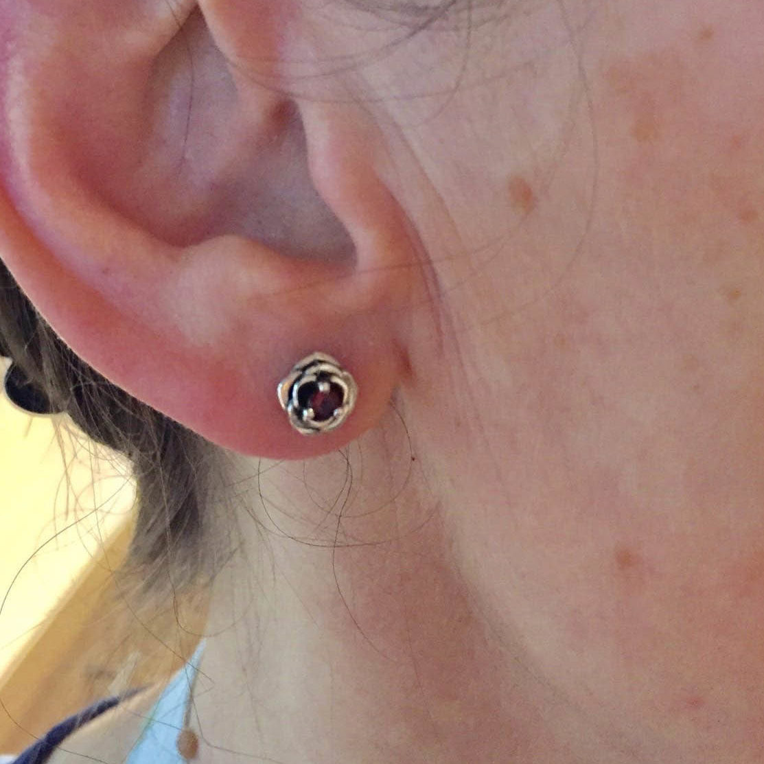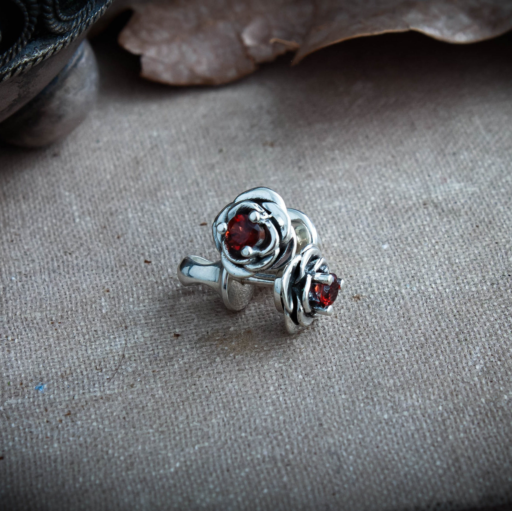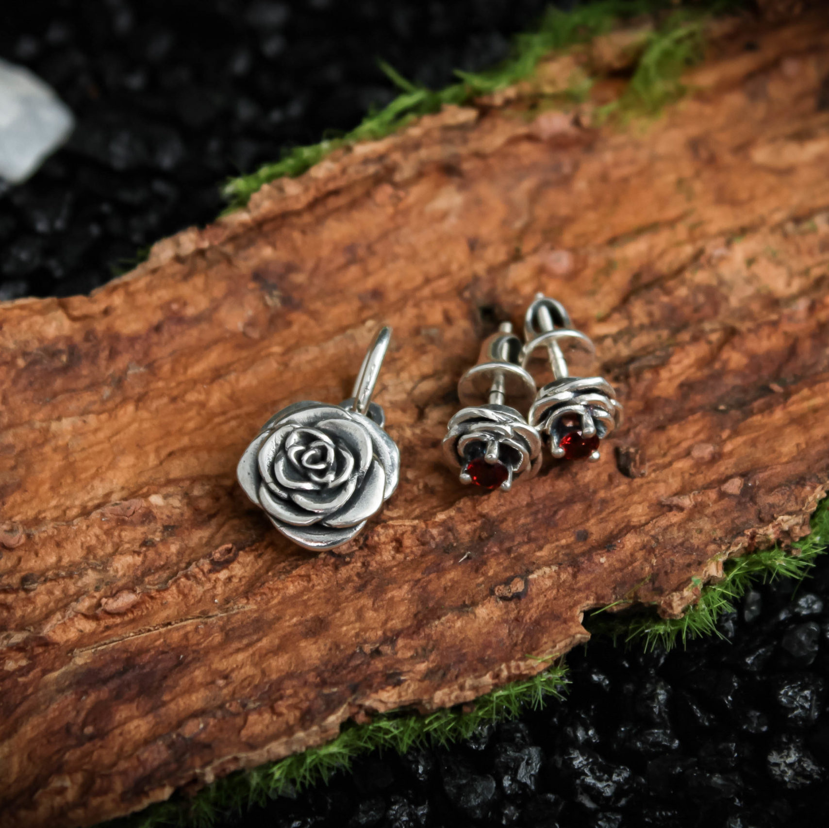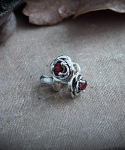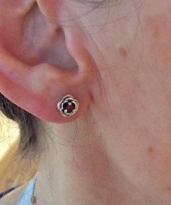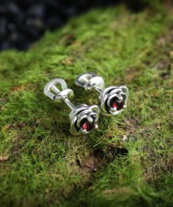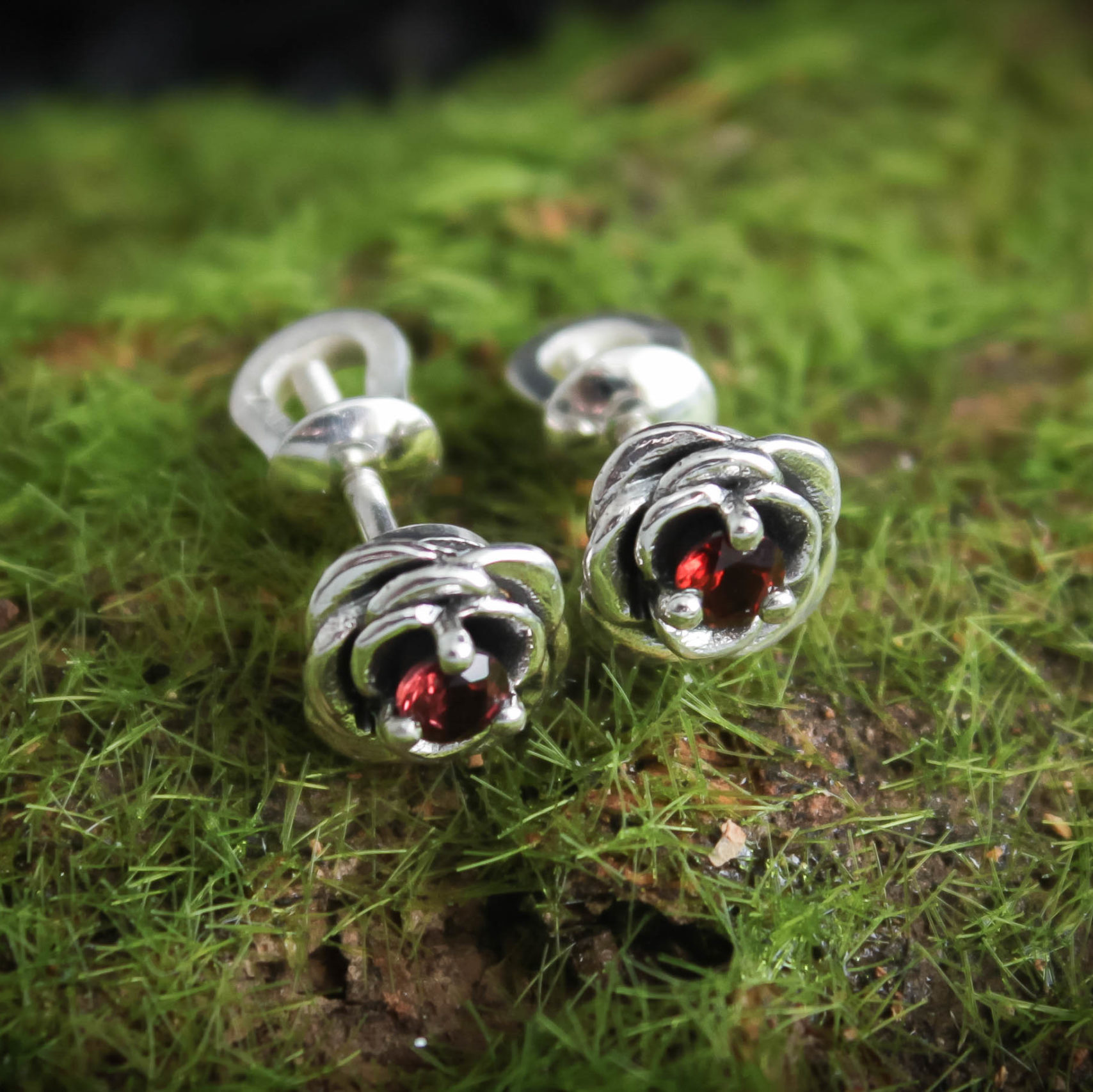 Crafted from silver and coated with decorative blackening to highlight the texture. They can be adorned with cubic zirconia in various colors of your choice or with natural dark red garnets.