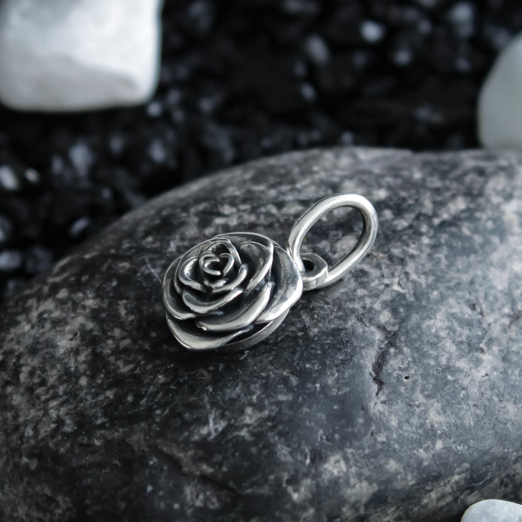 The pendant is crafted from Sterling silver, finished with decorative blackening to highlight the texture.