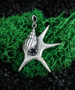 The pendant is crafted from Sterling silver, finished with decorative blackening to highlight the texture. It can be adorned with cubic zirconia in various colors of your choice or with natural dark red garnet.