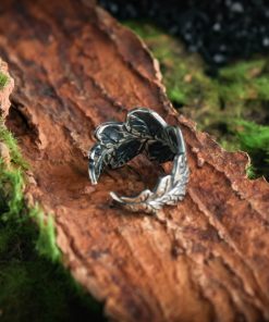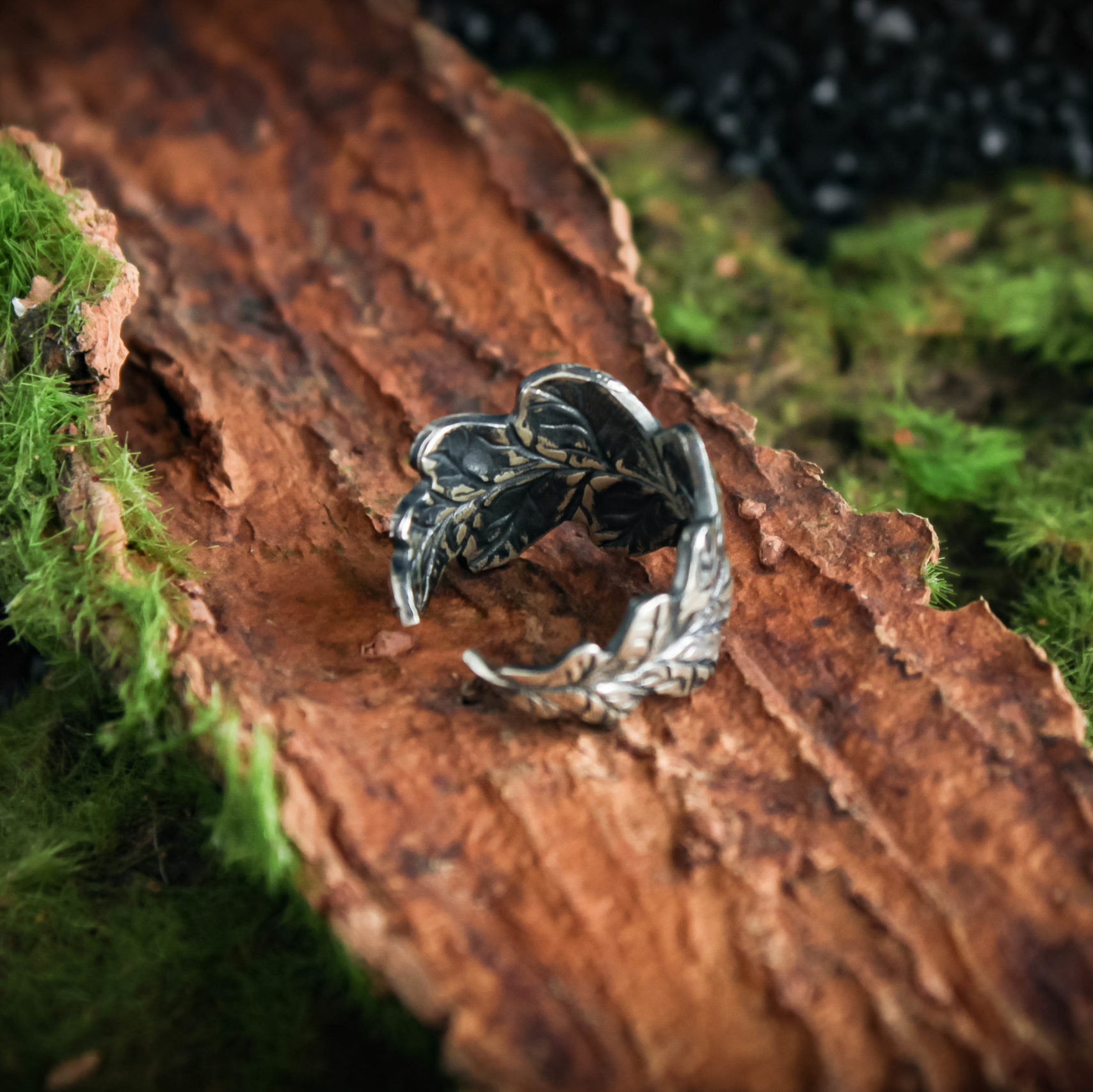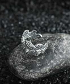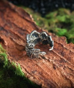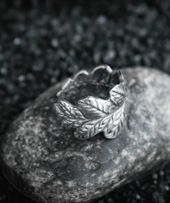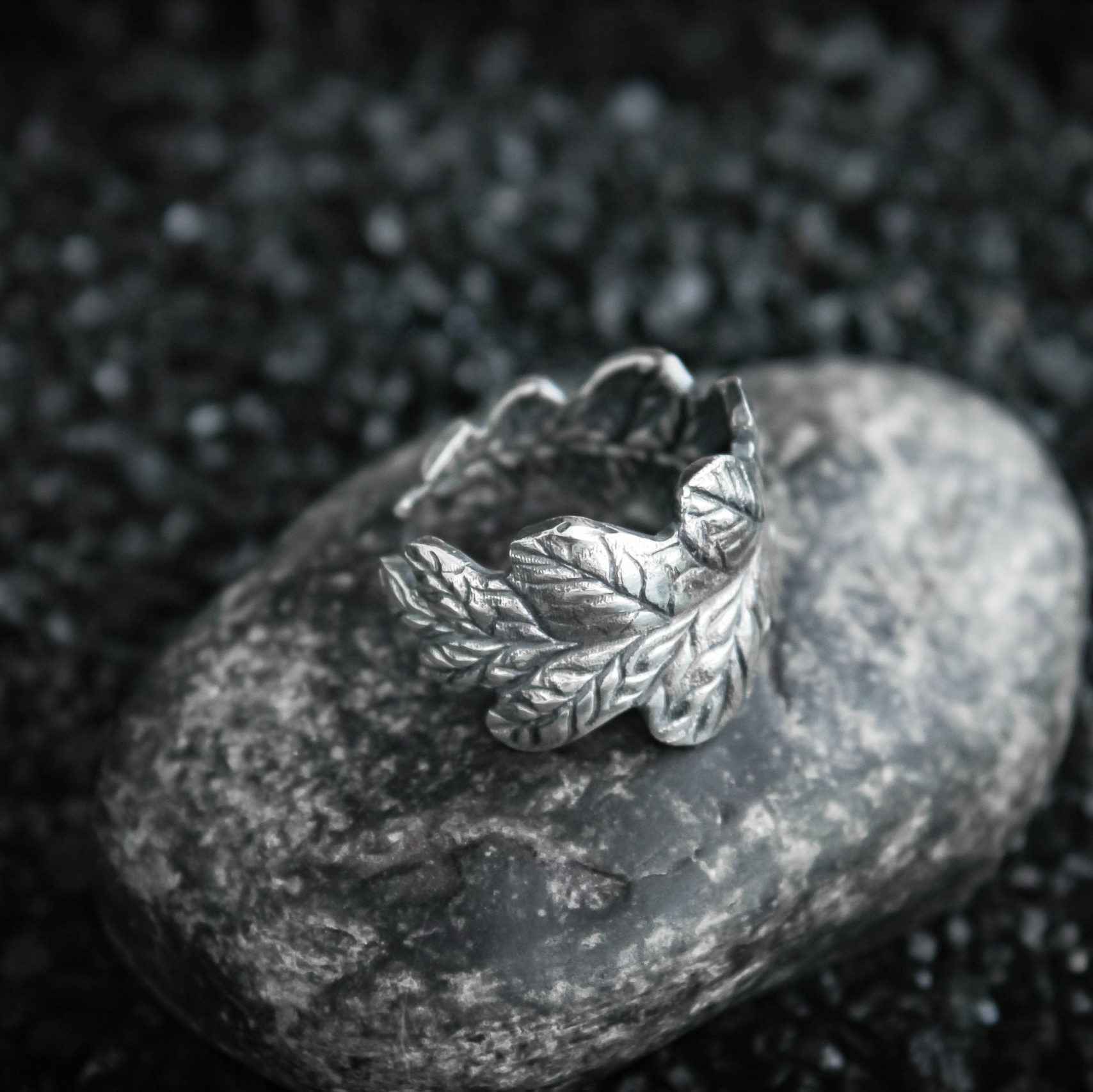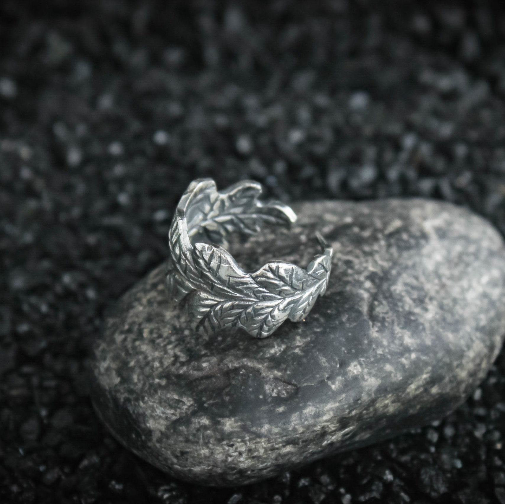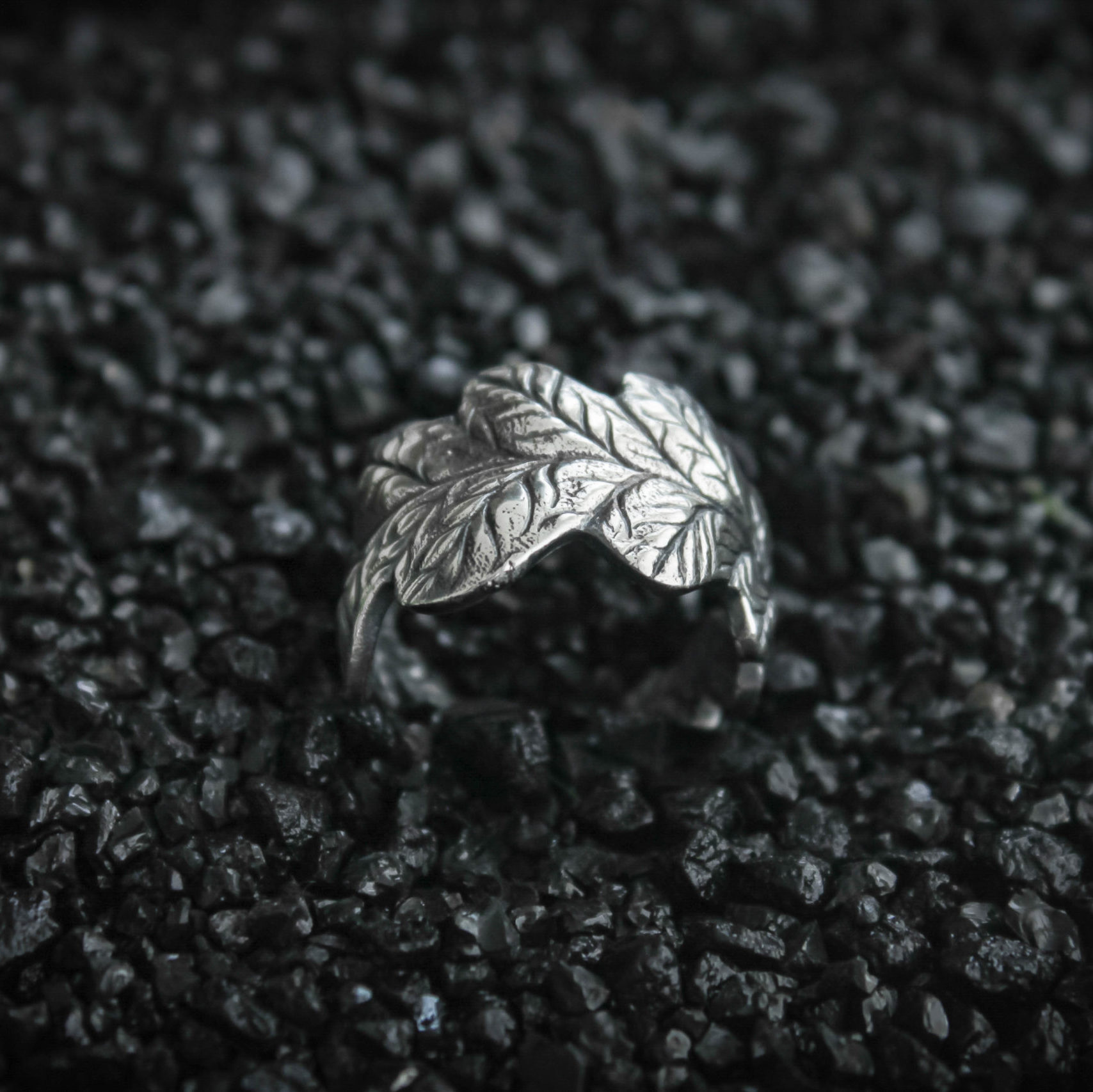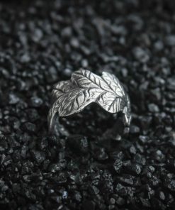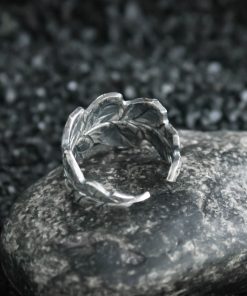 The ring is made of sterling silver, features decorative blackening to highlight its textures.