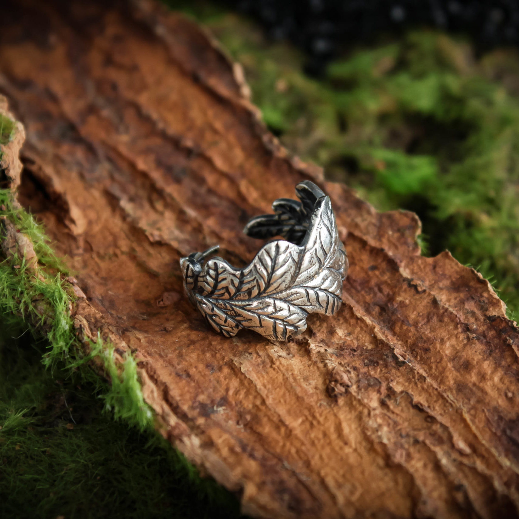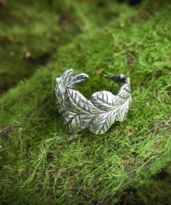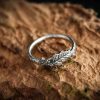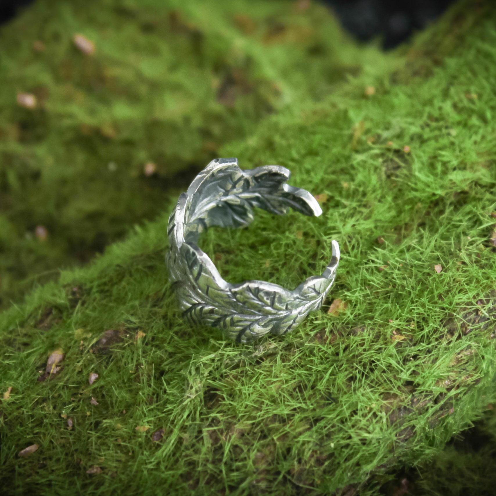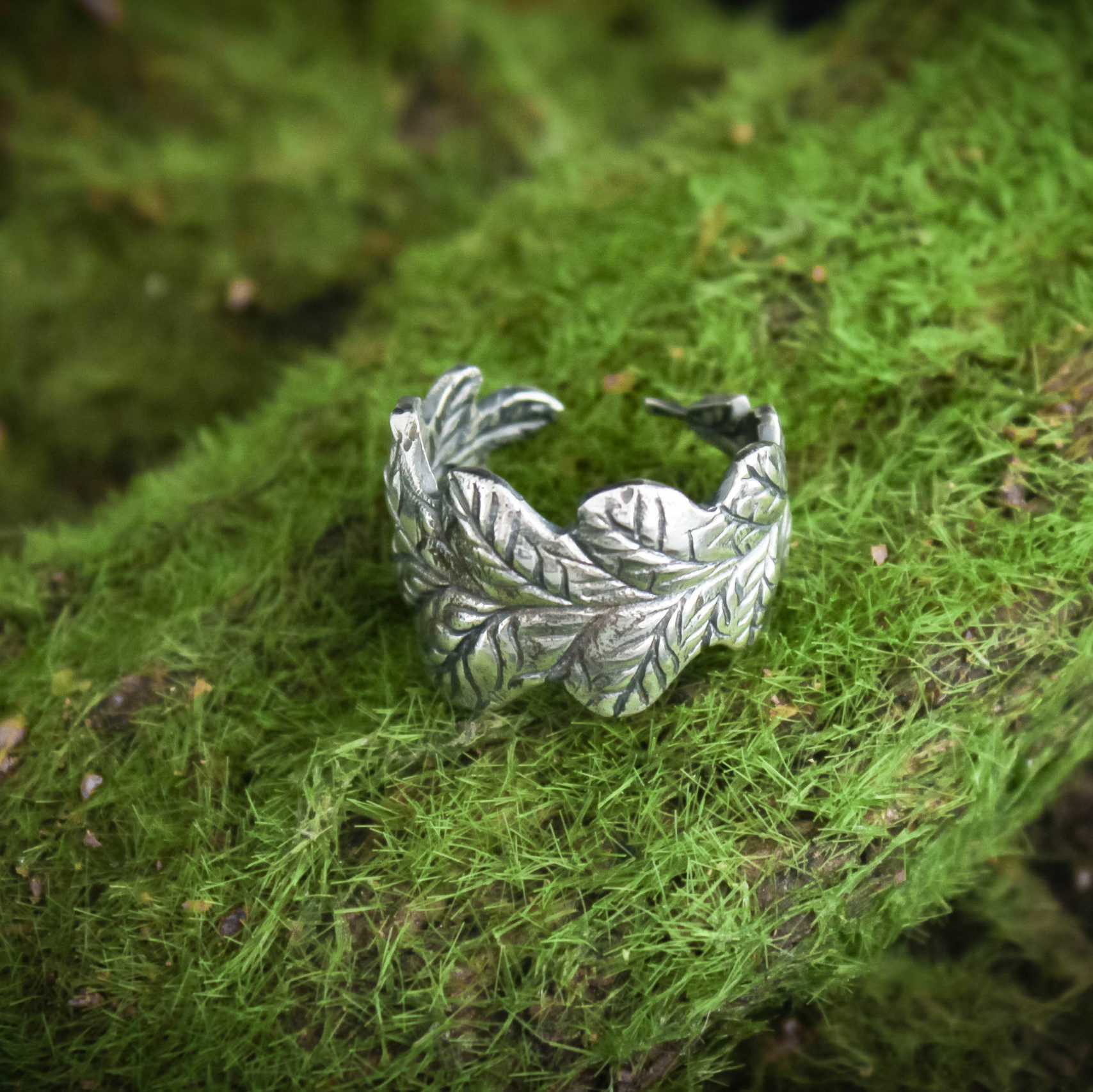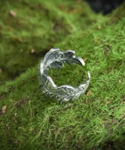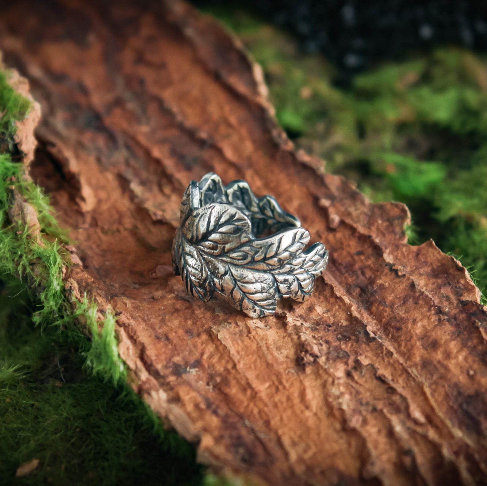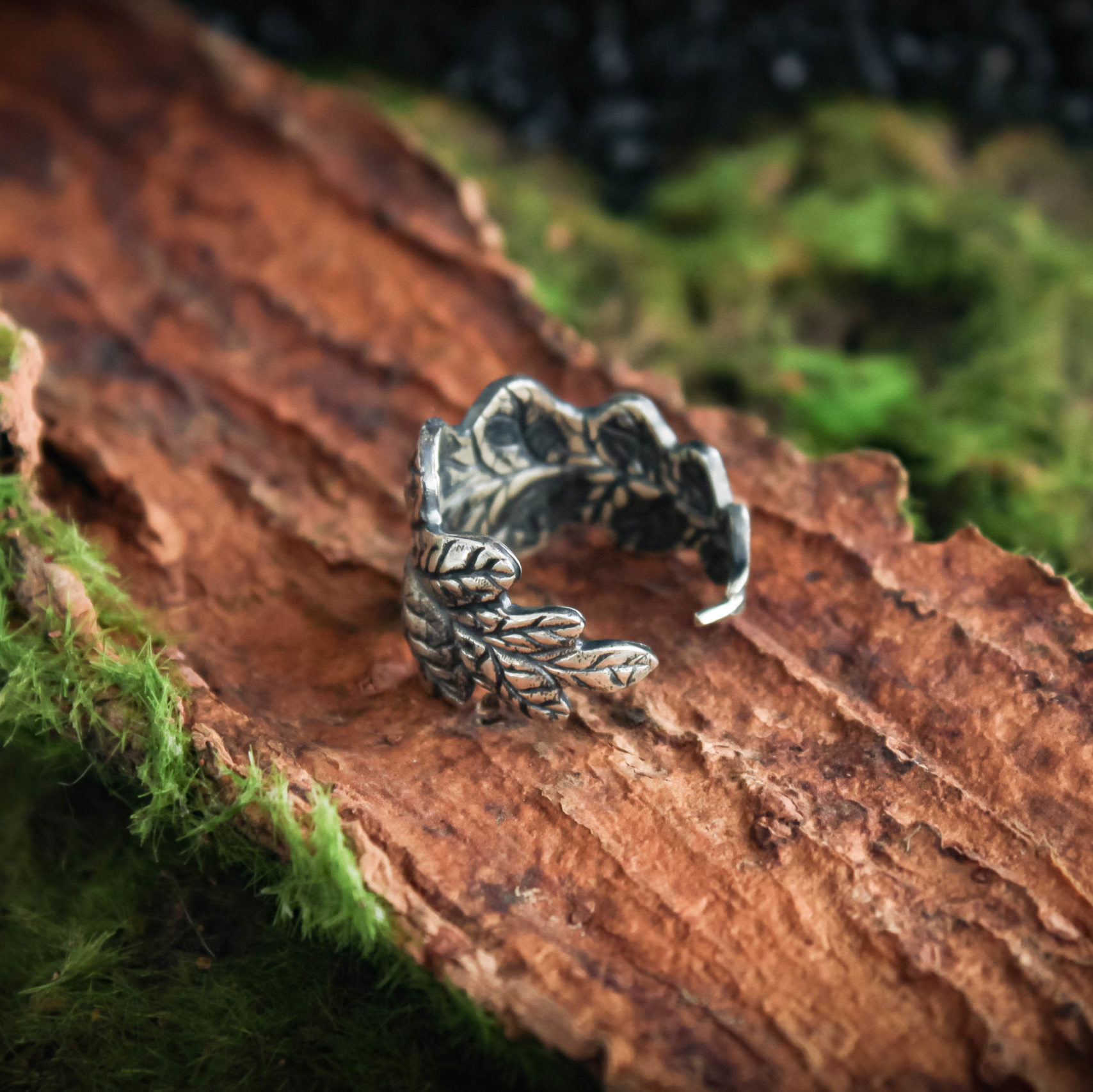 The ring is made of sterling silver, features decorative blackening to highlight its textures.