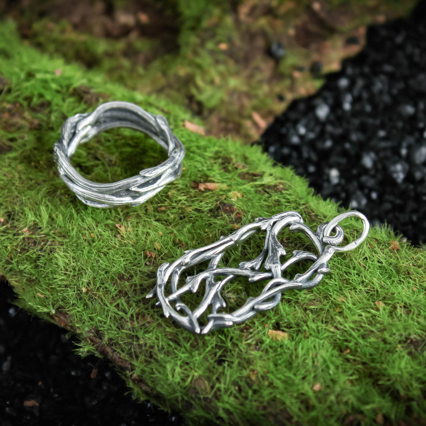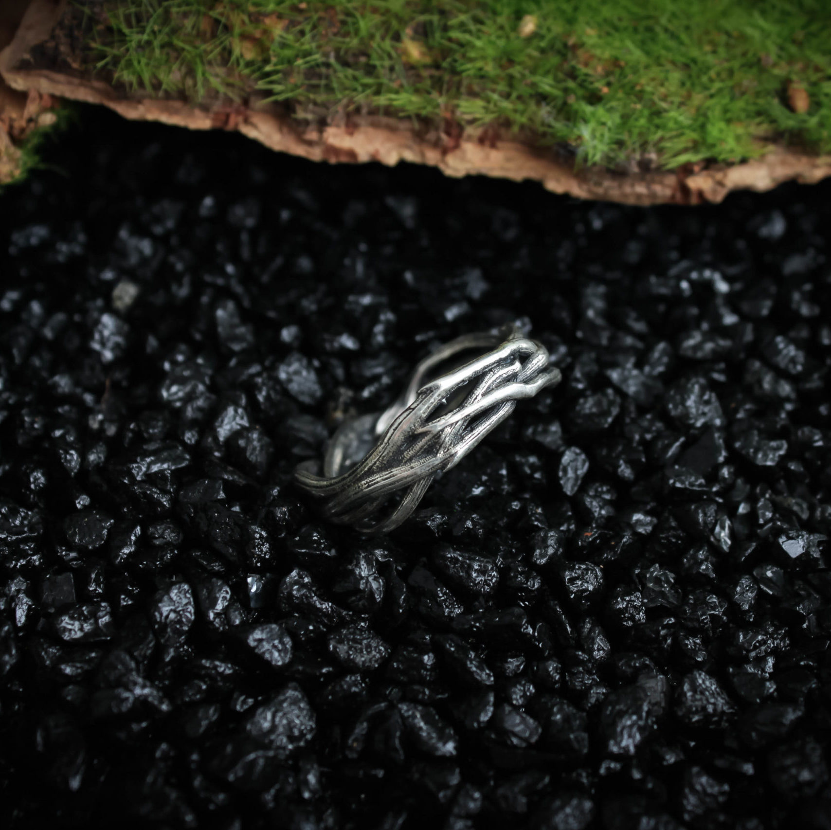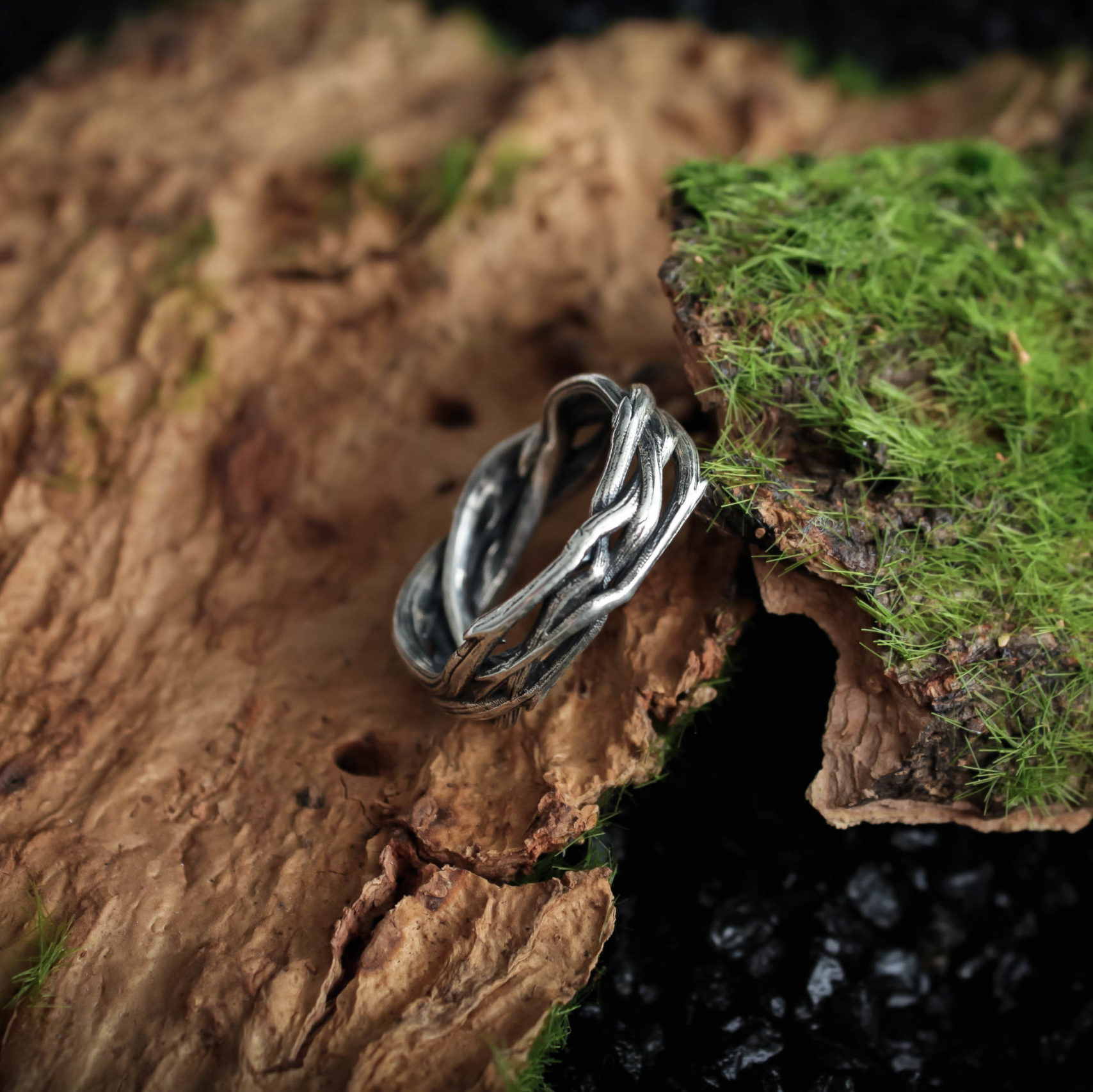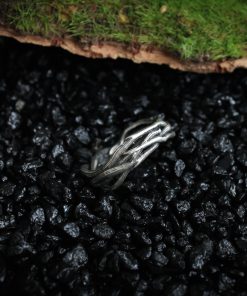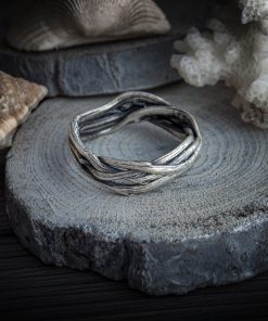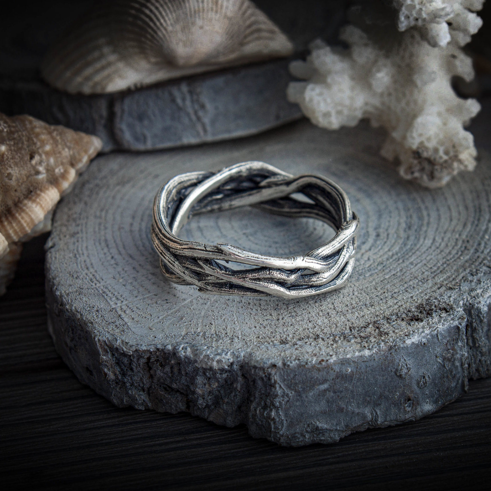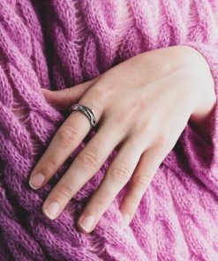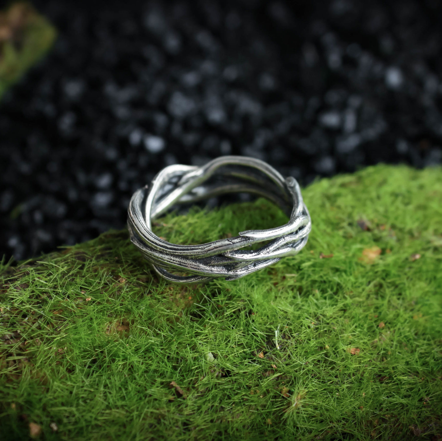 The ring is made of sterling silver, features decorative blackening to highlight its textures.
