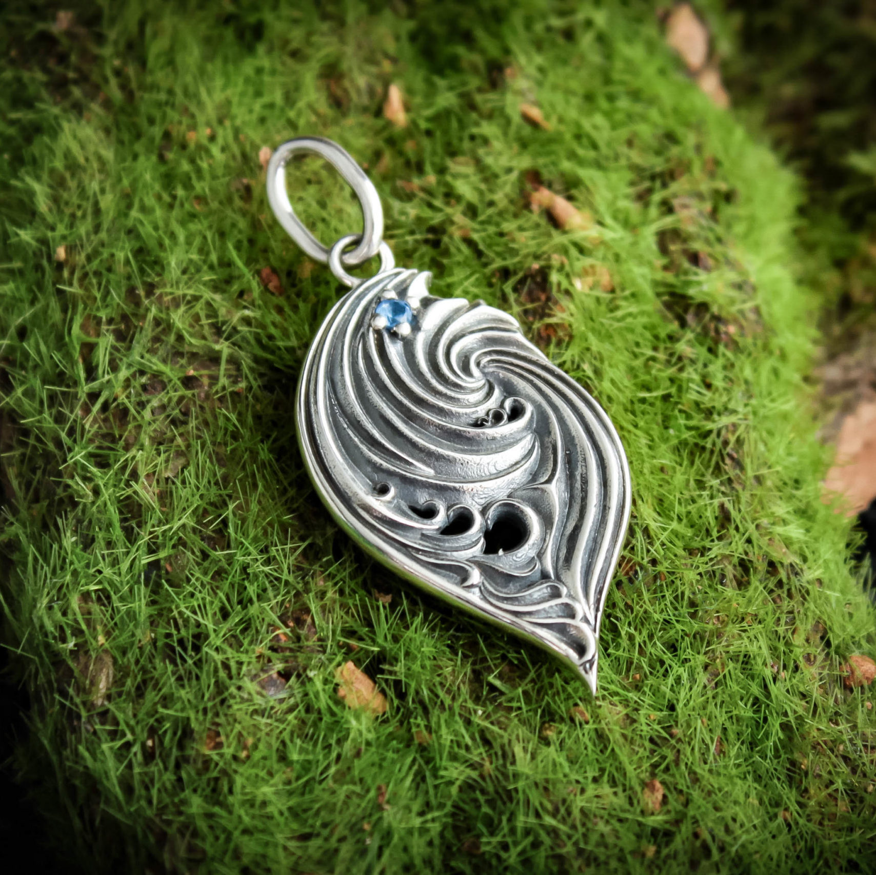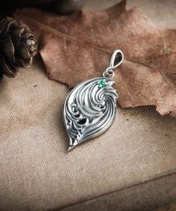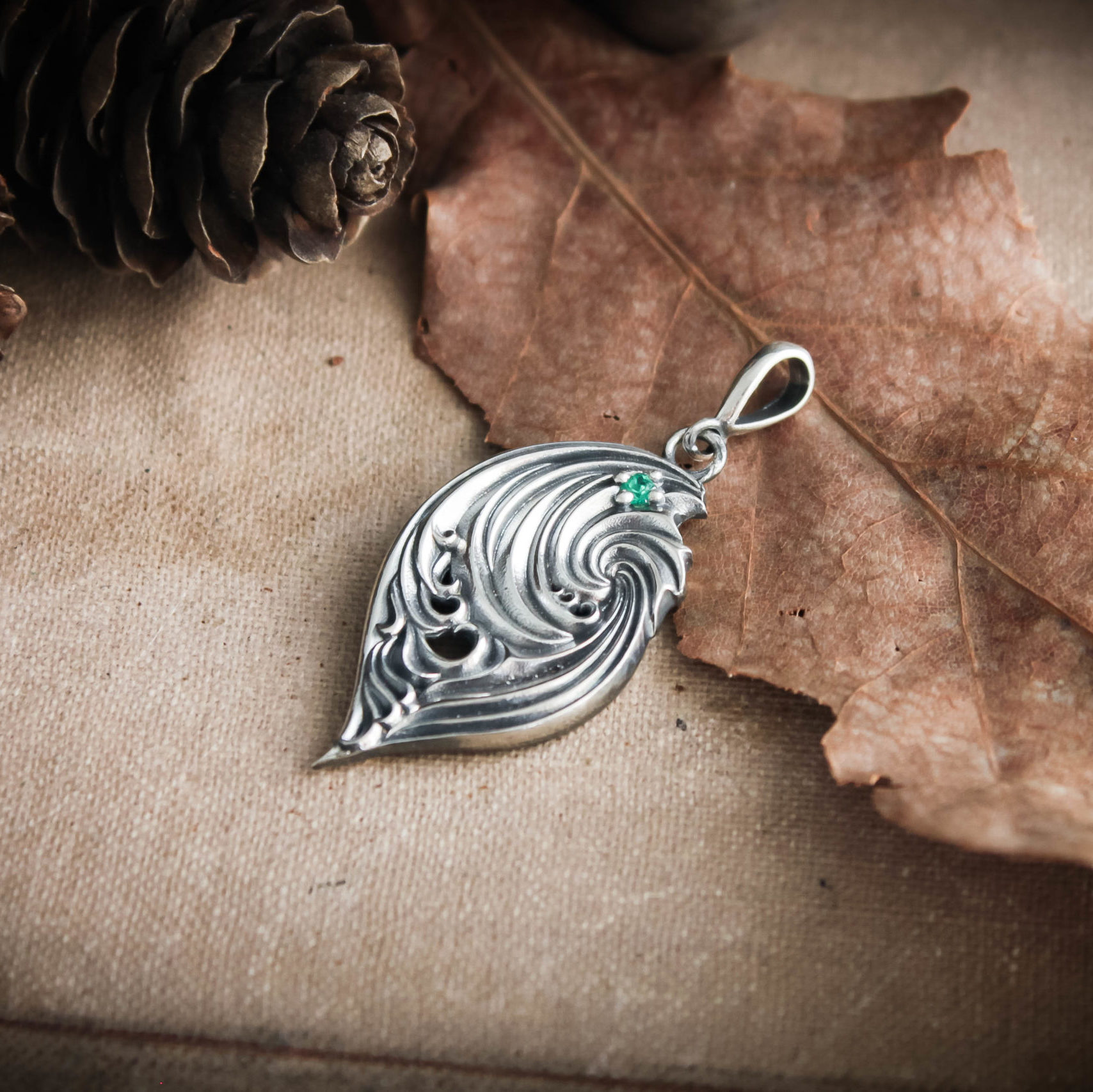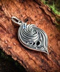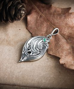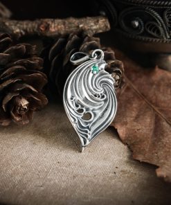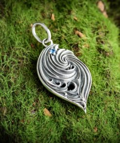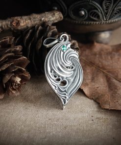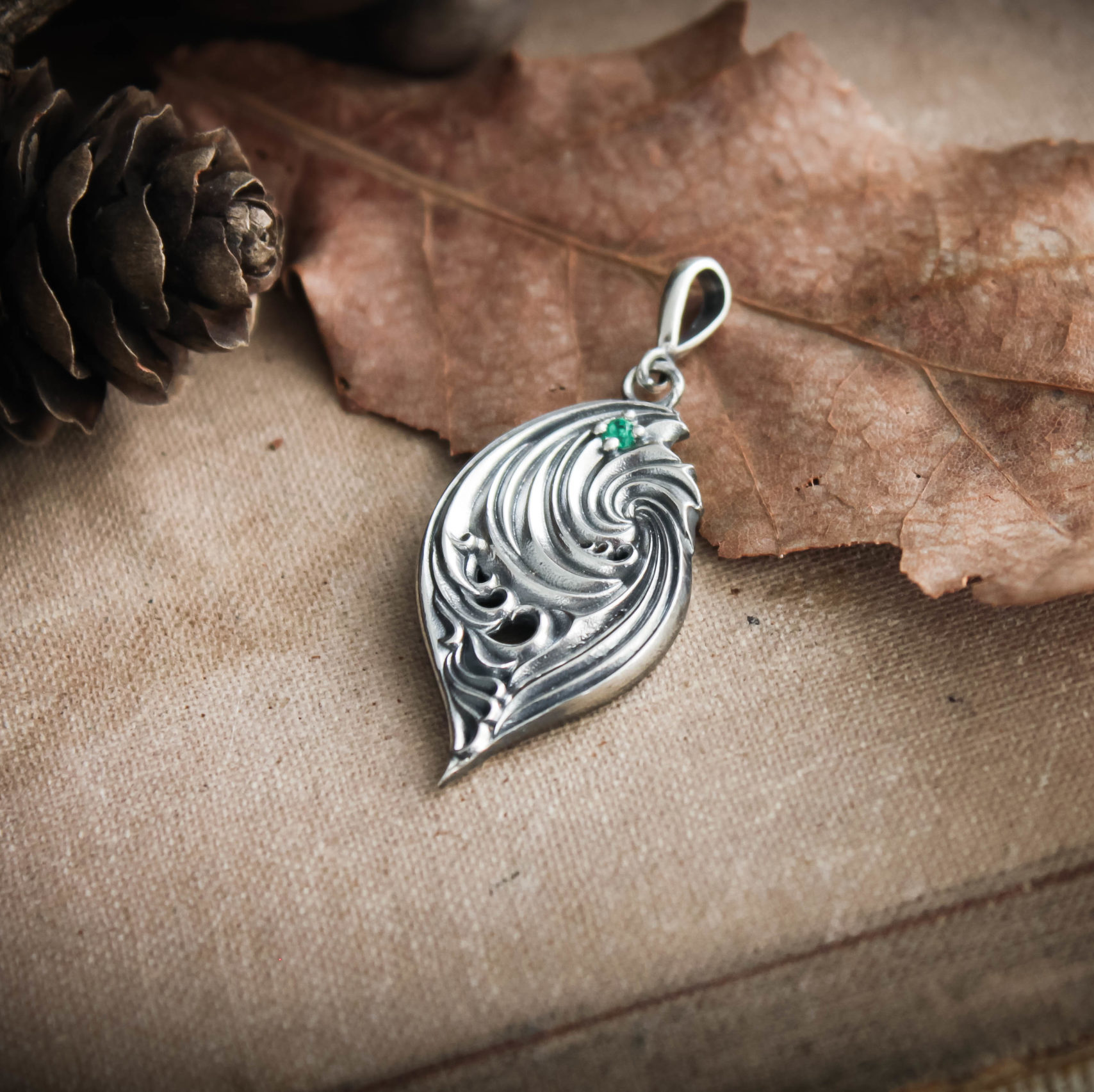 The pendant is crafted from Sterling silver, finished with decorative blackening to highlight the texture. It can be adorned with cubic zirconia in various colors of your choice or with natural dark red garnets.