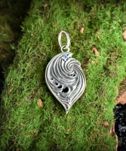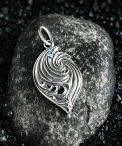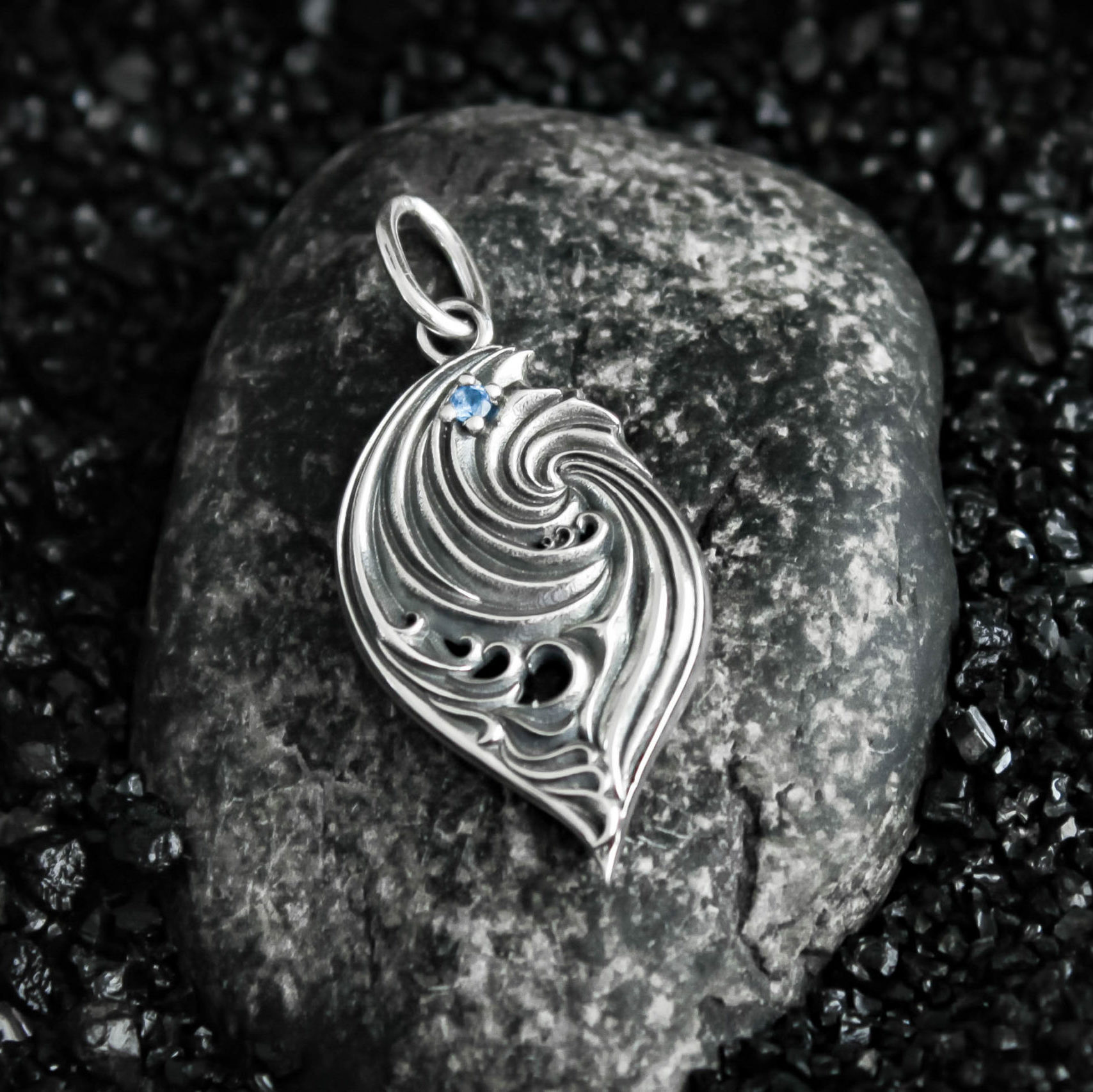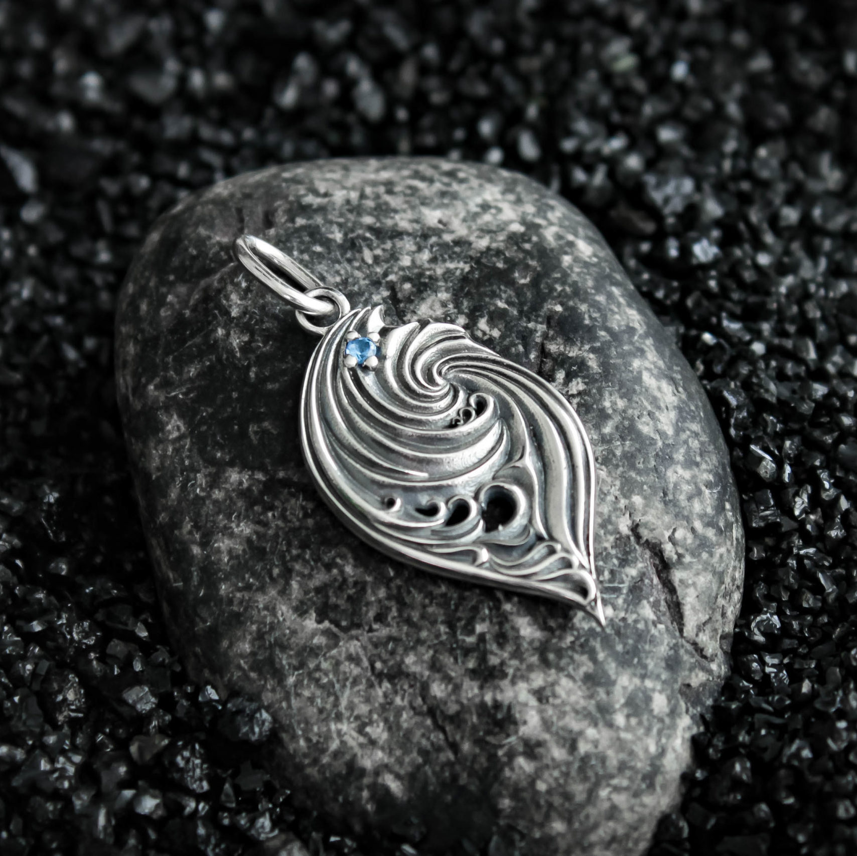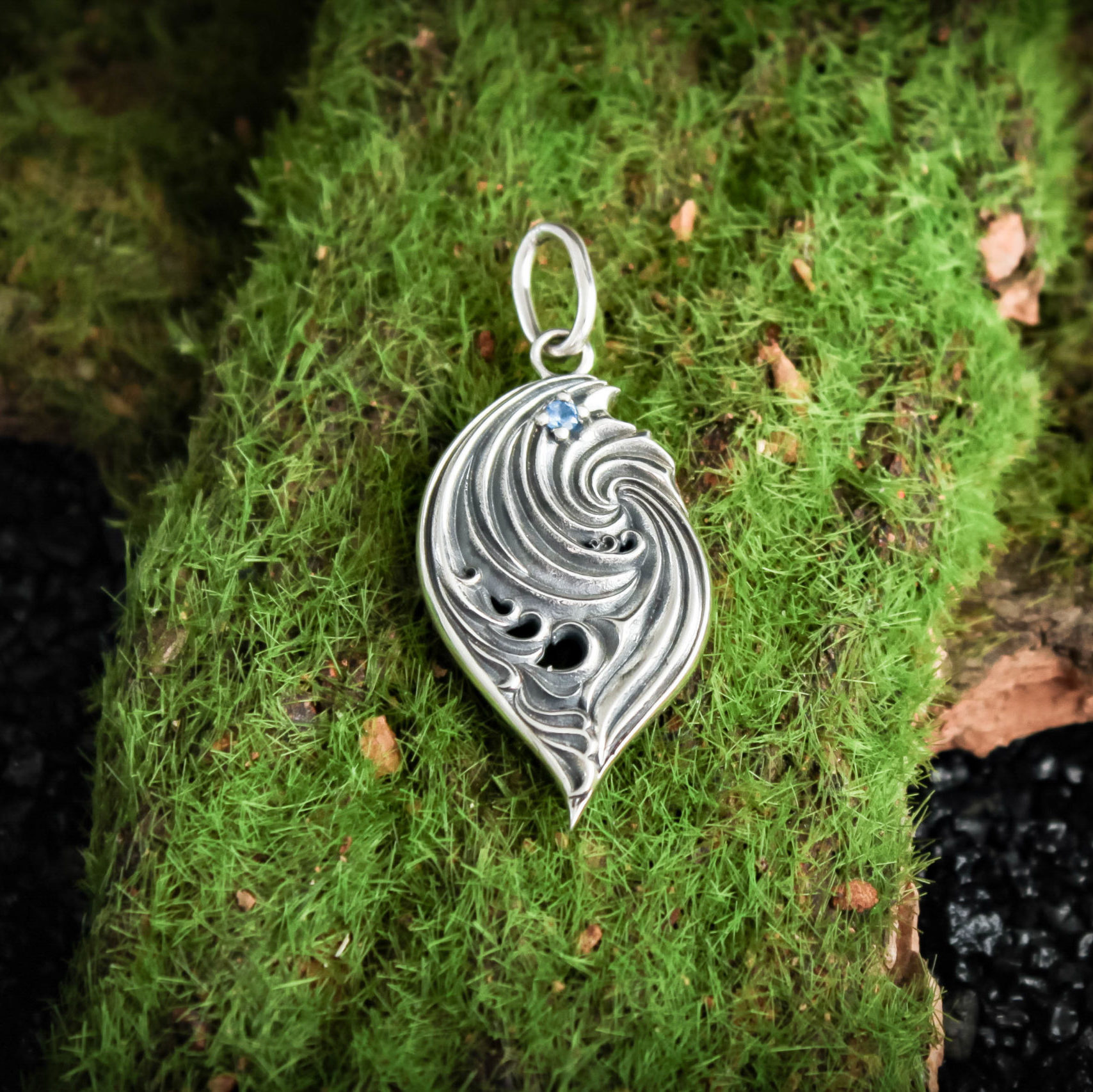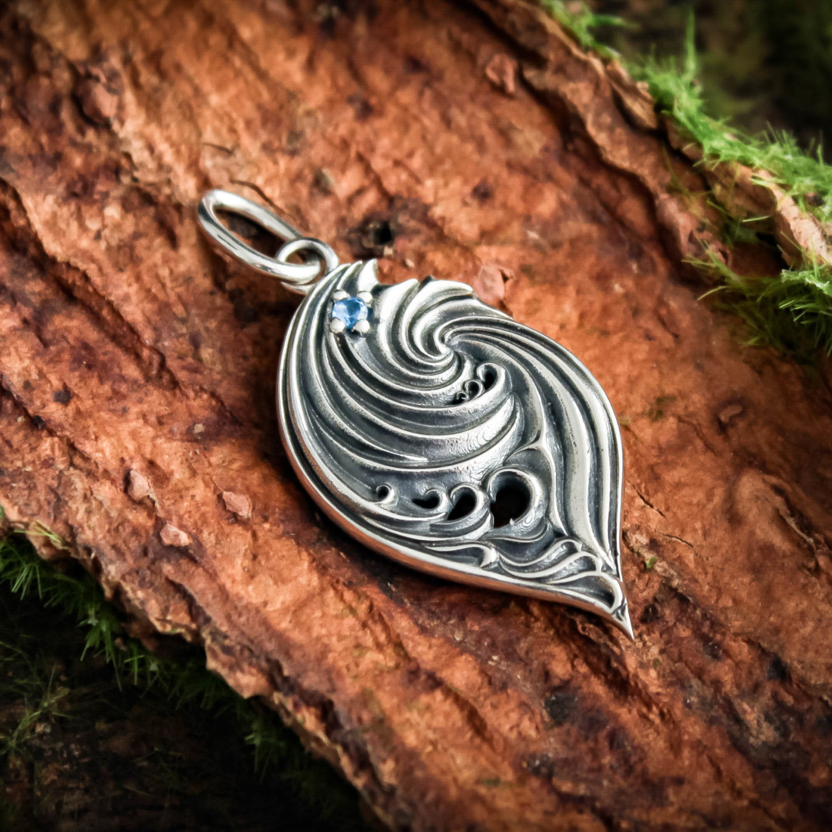 The pendant is crafted from Sterling silver, finished with decorative blackening to highlight the texture. It can be adorned with cubic zirconia in various colors of your choice or with natural dark red garnets.