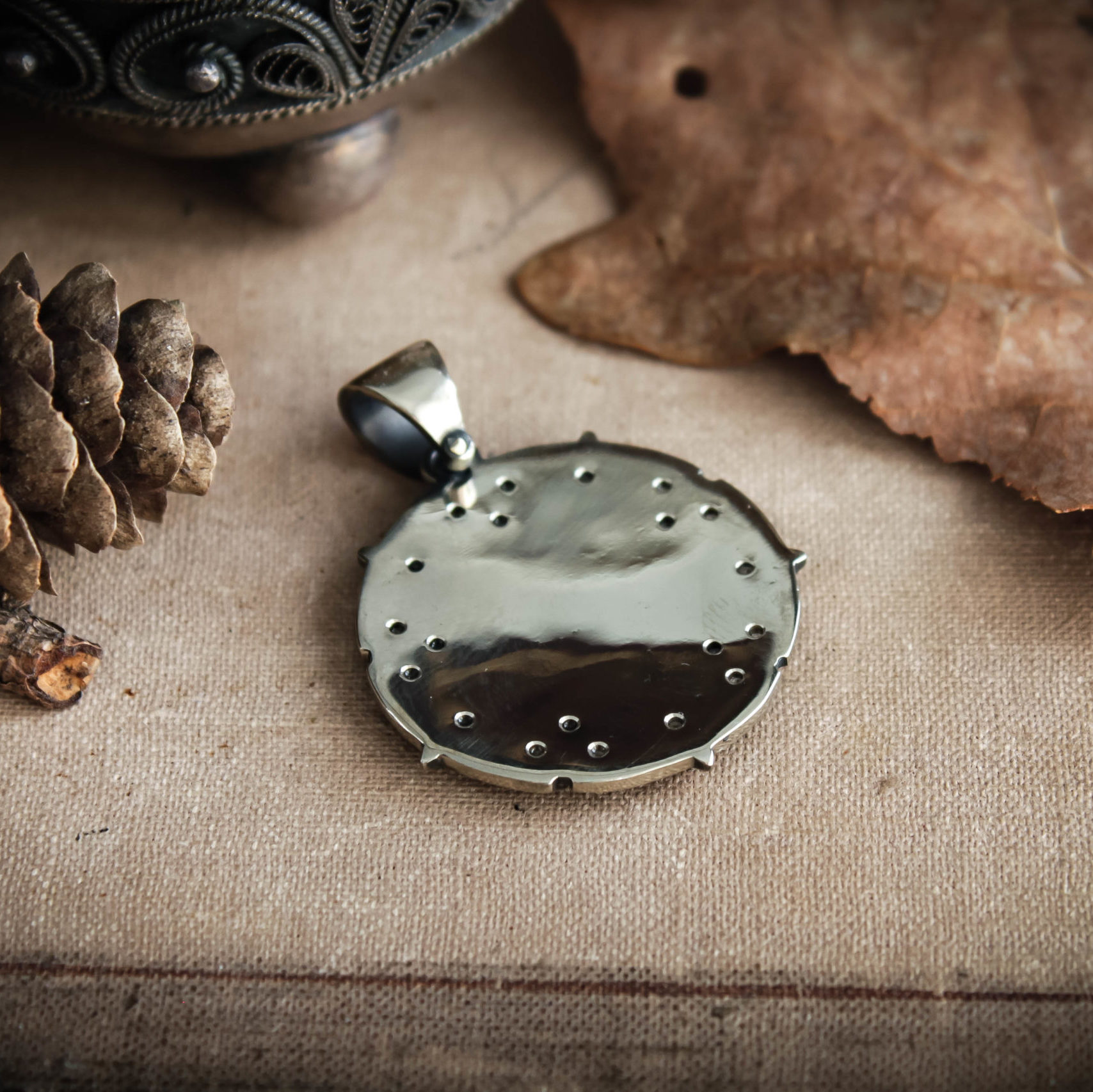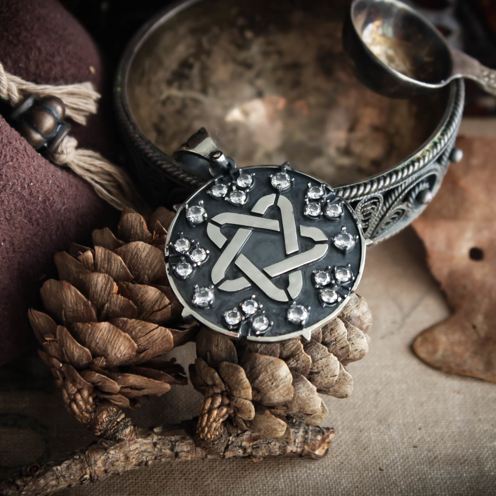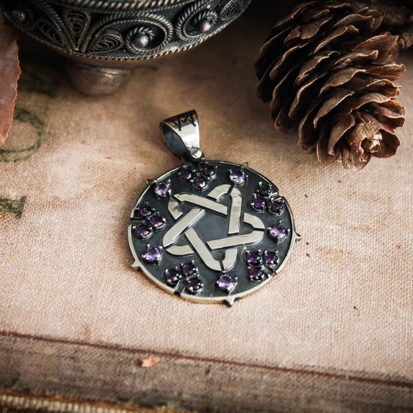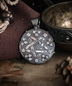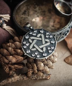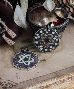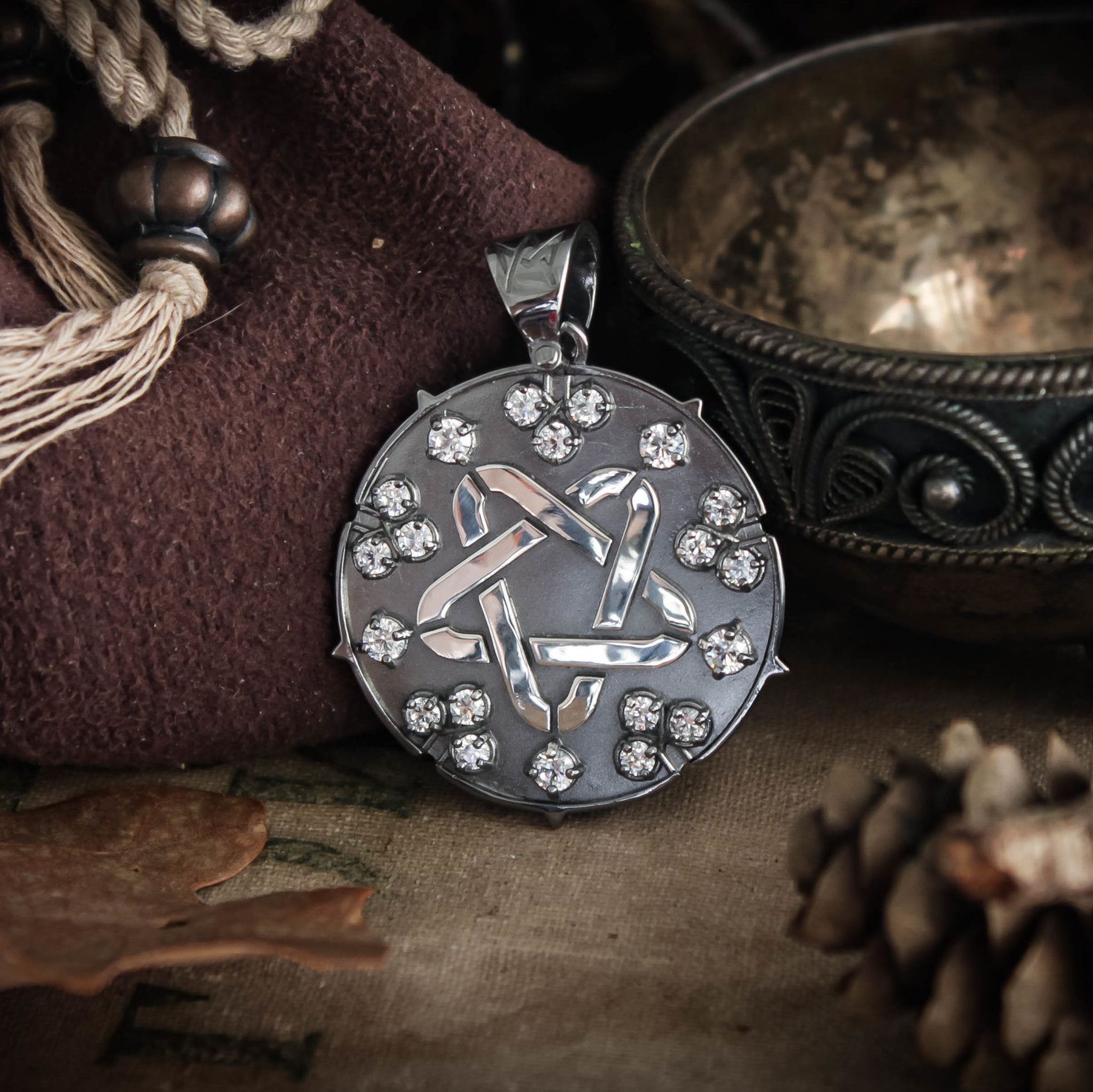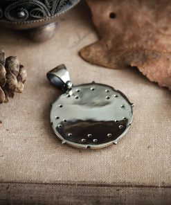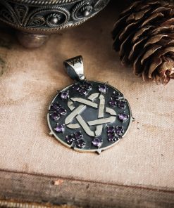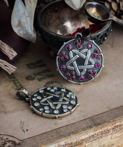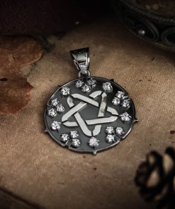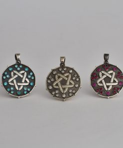 Sparking star medallion can be made in Nickel silver or Sterling silver plated with Black rhodium. It can be decorated with inserts of cubic zirconia stones of different colors or garnets.