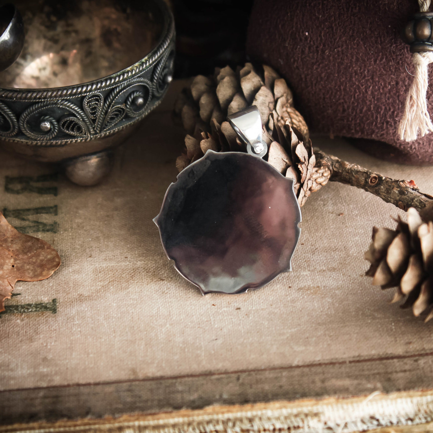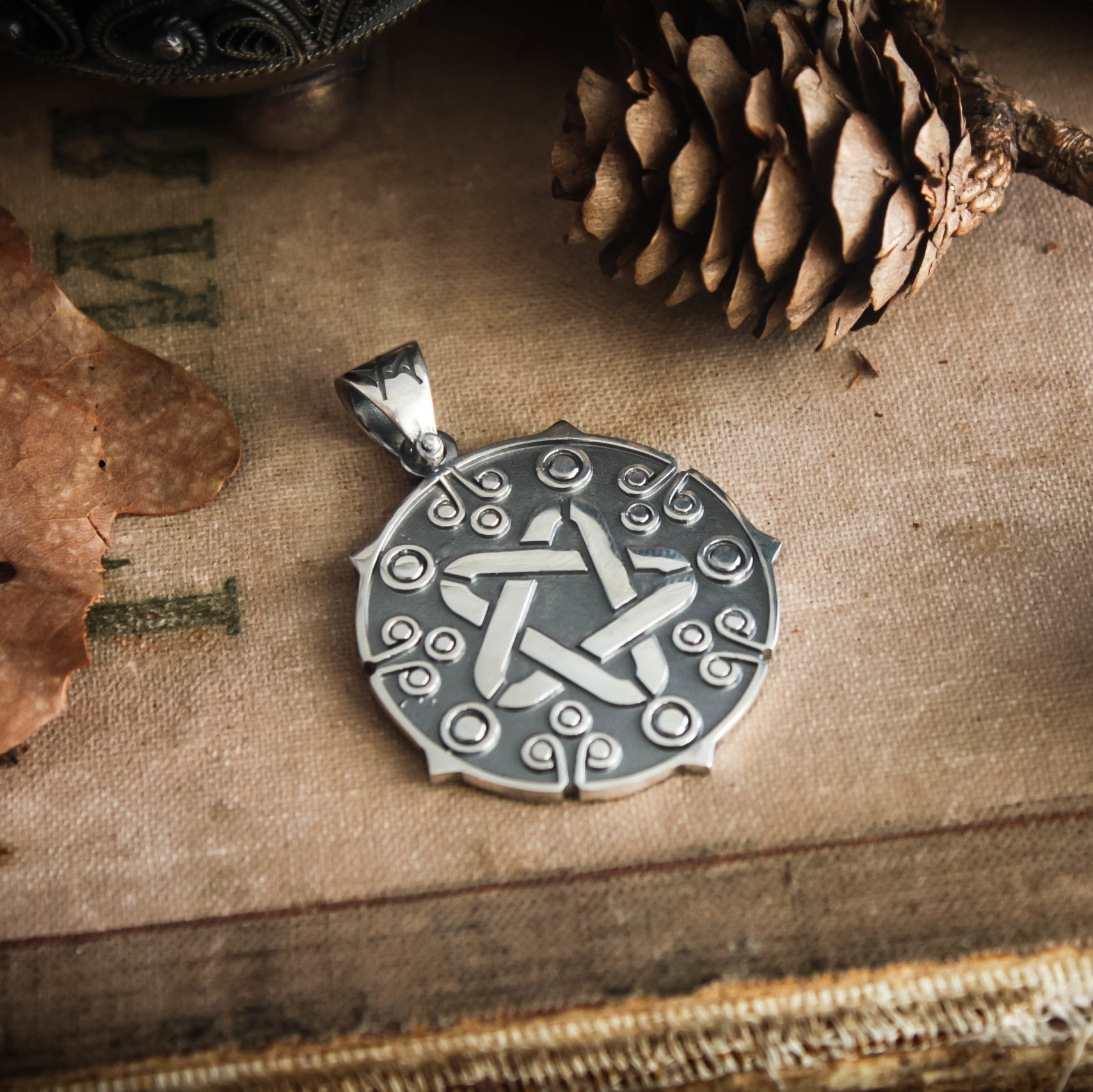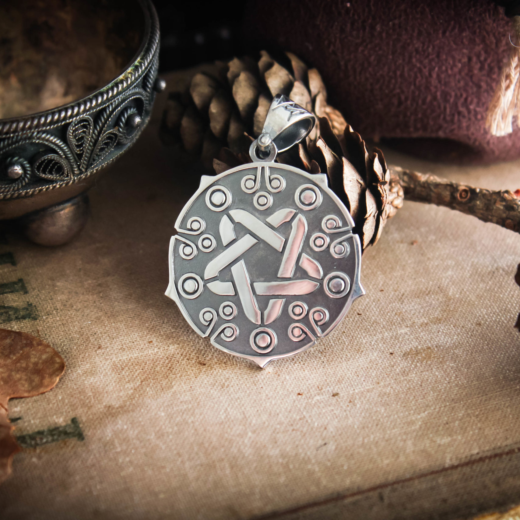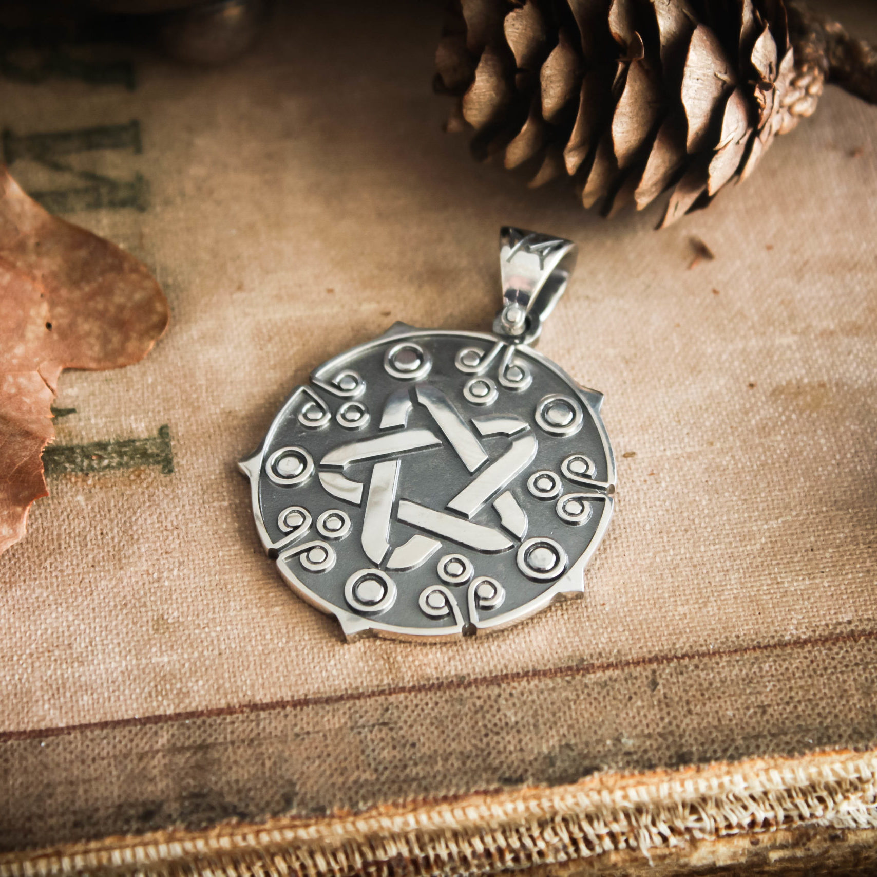 The Yennefer medallion can be made from Nickel silver with blackening or Sterling silver with black rhodium plating.