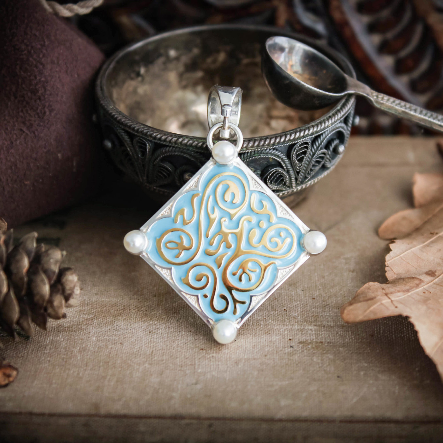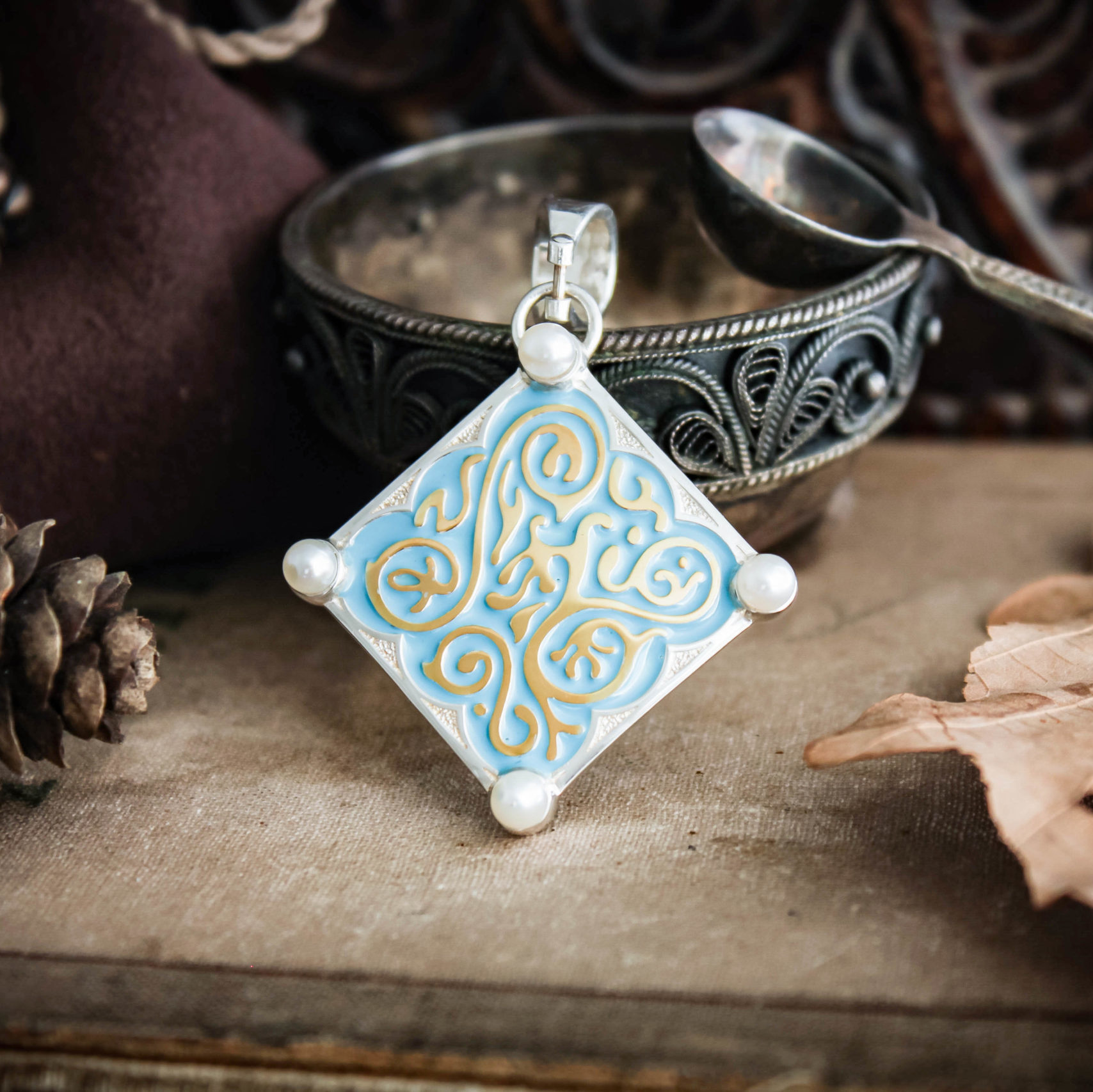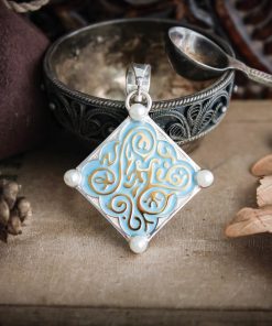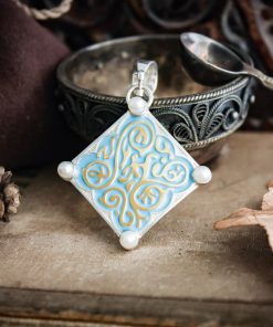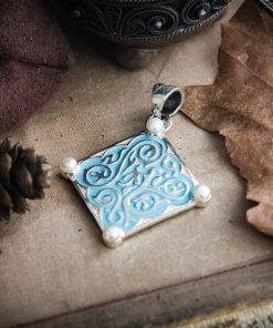 Triss Merigold Necklace comes in your choice Sterling silver or Sterling silver with Gold plating. It is decorated with blue enamel and natural pearls.